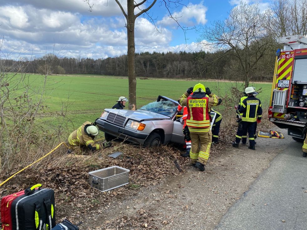 PKW prallt gegen Baum – eine Person eingeklemmt