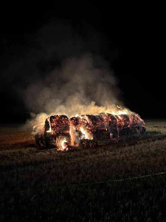 Fulde (tk) In den frühen Morgenstunden des 17.08.2025 gegen 00:36 Uhr bemerkten Passanten einen Feuerschein vom Meihremer Berg in Walsrode Richtung Fulde. Bei genauerer Prüfung stellte sich heraus, dass eine kleine Strohmiete mit circa 30 Rundballen in Flammen stand.