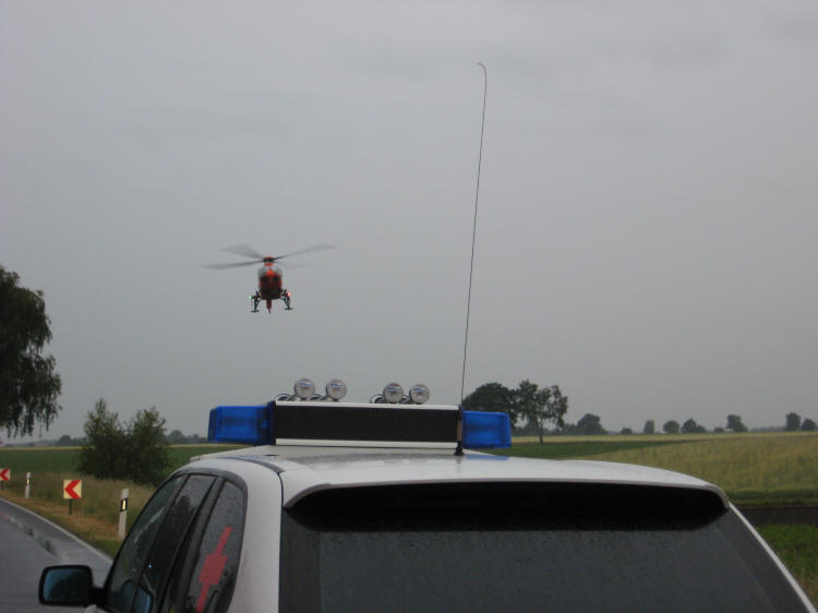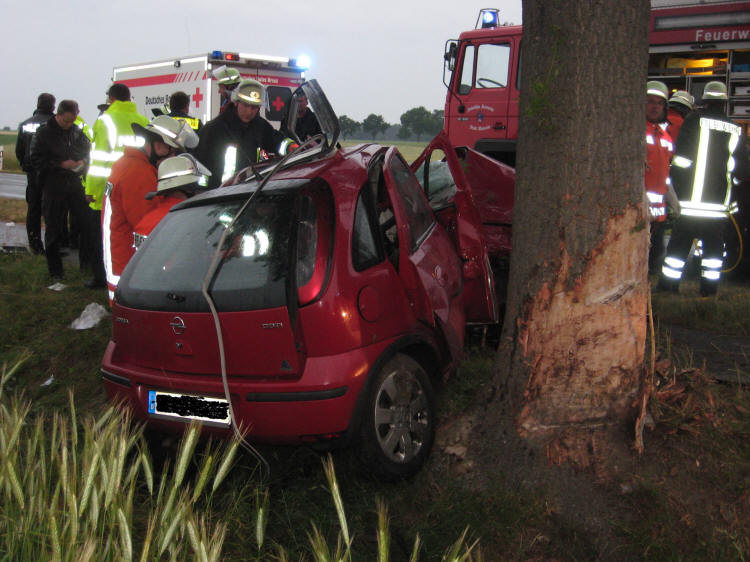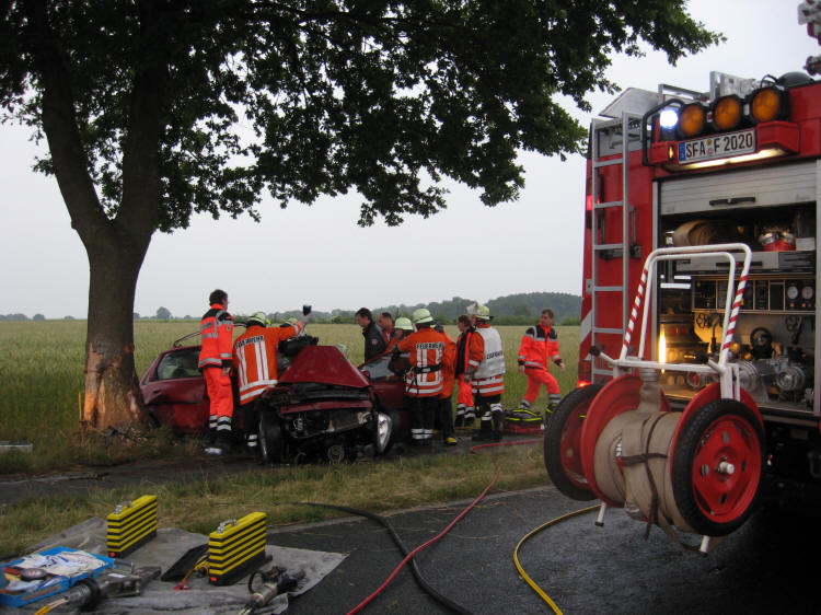 Um 20:03 Uhr wurden dann die Freiwilligen aus Kirchboitzen und Walsrode zu einem schweren Verkehrsunfall auf der B209 zwischen Kirchboitzen und Groß Eilstorf gerufen. Dort war eine 22-jährige Frau, die in Richtung Groß Eilstorf unterwegs war, aus bisher unbekannter Ursache mit ihrem Opel Corsa von der Fahrbahn abgekommen und mit der Beifahrerseite gegen einen Straßenbaum geprallt. Dabei wurde sie schwer verletzt in ihrem Fahrzeug eingeklemmt. Sie musste von der Feuerwehr, die mir sieben Fahrzeugen und 38 Helfern vor Ort war, mittels hydraulischem Rettungsgerät befreit werden. Danach wurde sie an das DRK Walsrode, das mit vier Mitarbeitern und zwei Fahrzeugen ausgerückt war, übergeben. Nach der Erstversorgung wurde sie mit dem Rettungshubschrauber in die Medizinische Hochschule Hannover geflogen. An dem PKW entstand Totalschaden, während der Rettungsarbeiten musste die Bundestrasse komplett gesperrt werden. Die Polizei war mit zwei Fahrzeugen und vier Beamten vor Ort, die Ermittlungen zur Unfallursache dauern zur Zeit noch an. Ebenfalls vor Ort waren der Stadtbrandmeister Richard Meyer, sein Stellvertreter Volker Langrehr sowie die Straßenmeisterei. Ein Mitglied des DRK sowie ein Aktiver des THW kamen zufällig auf den Unfall zu und leisteten Erste Hilfe.