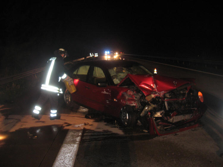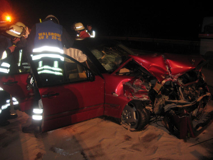 Walsrode (jf) Erneut wurden die Freiwilligen der Ortsfeuerwehr Walsrode am Samstag zu einem Verkehrsunfall alarmiert. Gegen 20:40 Uhr war auf der A27 war ein Mercedes Benz E300 in Fahrtrichtung Bremen unter einen Molke-LKW gefahren. Laut Zeugenaussagen war er zuvor mit hoher Geschwindigkeit auf der Überholspur unterwegs und übersah dabei einen 7.5t Transporter, der gerade den Molke-LKW überholte. Der Mercedes kam ins Schleudern, kollidierte mit dem Tank-LKW und touchierte dann noch die Leitplanke, bevor er total beschädigt auf der Normalfahrbahn zum Stehen kam. Der 63-jährige Fahrer aus Nordholz sowie seine Frau wurden wie durch ein wunder nur leicht verletzt und wurden vor Ort vom Rettungsdienst versorgt. Die 18 Kräfte der Feuerwehr, die mit zwei Fahrzeugen vor Ort waren, nahm ausgelaufene Mineralöle auf, leuchteten den Schadenort aus und unterstützten die Räumung der Autobahn. Der Verkehr wurde durch die Polizei einspurig an der Unfallstelle vorbei geleitet.