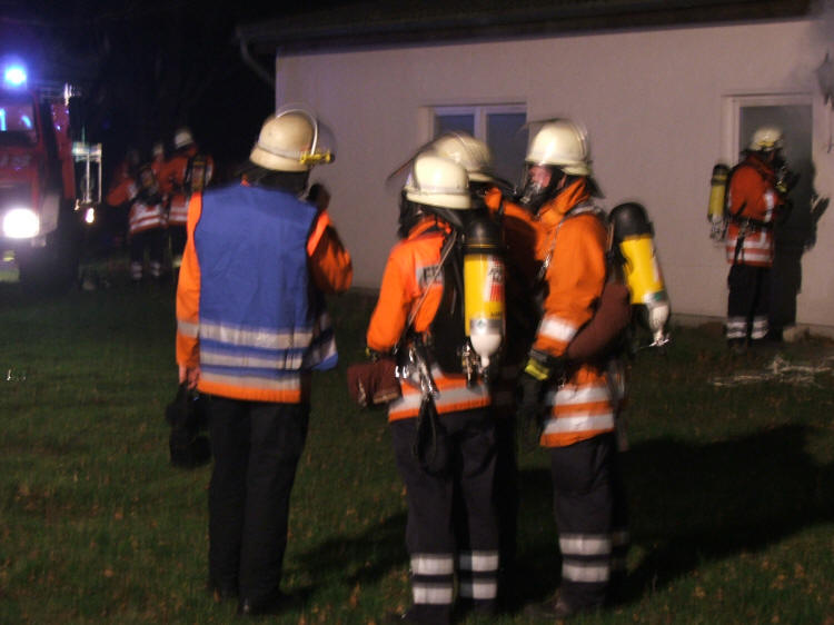 Im hinteren Gebäudeteil ist es in der Küche aus ungeklärter Ursache zu einem Brand gekommen. Nach kurzer Zeit sind bereits die ersten Einsatzkräfte vor Ort. Zu diesem Zeitpunkt werden noch fünf Personen in dem Gebäude vermisst. Mehrere Trupps unter Atemschutz begannen sofort mit der Personensuche in der stark verqualmten Wohnung. Gleichzeitig wurde von Außen mit der Brandbekämpfung begonnen. Die nachrückenden Kräfte der Feuerwehr Hope hatten die Aufgabe eine Wasserversorgung von einem 200 Meter entfernten Unterflurhydranten aufzubauen. Nach 45 Minuten war der Brand gelöscht und alle vermissten Personen gerettet. Insgesamt waren 35 Einsatzkräfte mit vier Fahrzeugen vor Ort. Zum Glück handelte es sich bei diesem Einsatz nur um eine Übung, die vom Ortsbrandmeister Detlef Röhm ausgearbeitet wurde. Der Schwerpunkt wurde diesmal auf die Menschenrettung und die Atemschutzüberwachung gelegt. Der Bürgermeister der Gemeinde Lindwedel Axel Wehberg überzeugte sich persönlich von dem Können seiner Feuerwehren. Gemeindebrandmeister Rainer Priebe zeigte sich bei der anschließenden Manöverkritik zufrieden mit den Leistungen der Brandschützer und bedankte sich für ihre Einsatzbereitschaft.