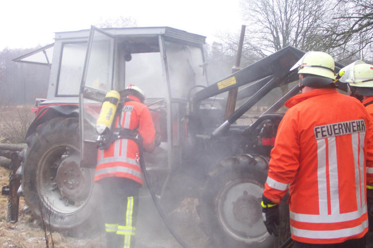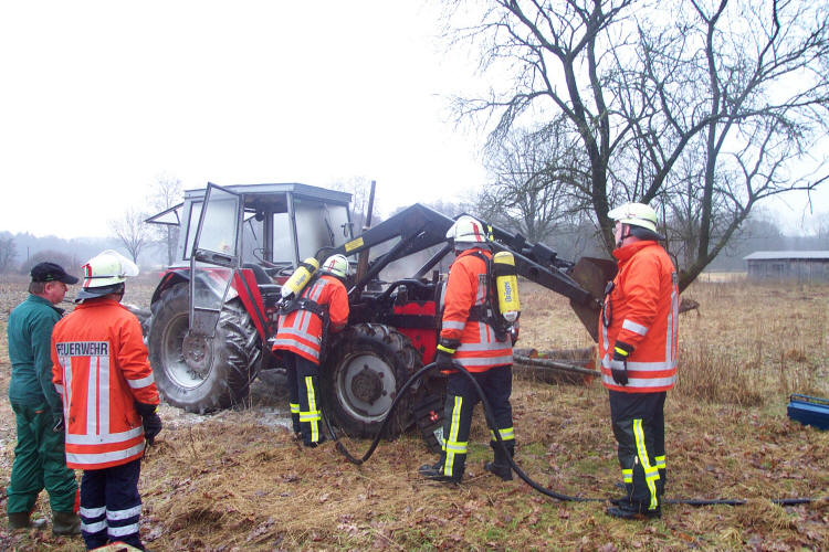 Jettebruch Ein technischer Defekt war die Ursache für einen Schlepperbrand am Samstag Nachmittag in Jettebruch. Nachdem der Besitzer eine Rauchentwicklung unter der Motorhaube seines Traktors bemerkte, alarmierte er sofort über Notruf die Feuerwehr. Noch während der Anfahrt der Brandschützer aus Dorfmark konnte er mit einem Feuerlöscher den Brand eindämmen. Die 20 Einsatzkräfte mußten lediglich noch kleine Brandnester mit 100 Litern Wasser löschen. Am Schlepper entstand erheblicher Sachschaden.