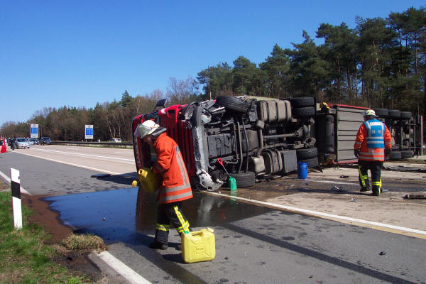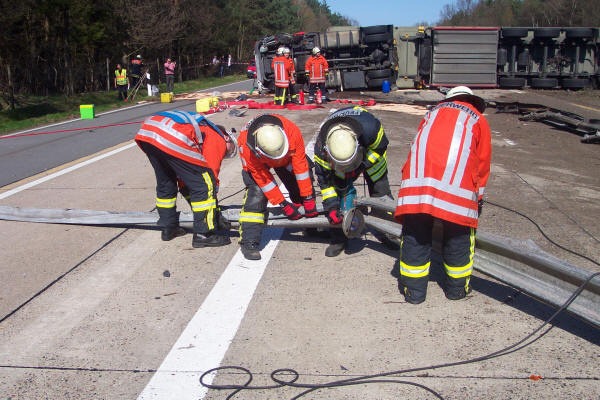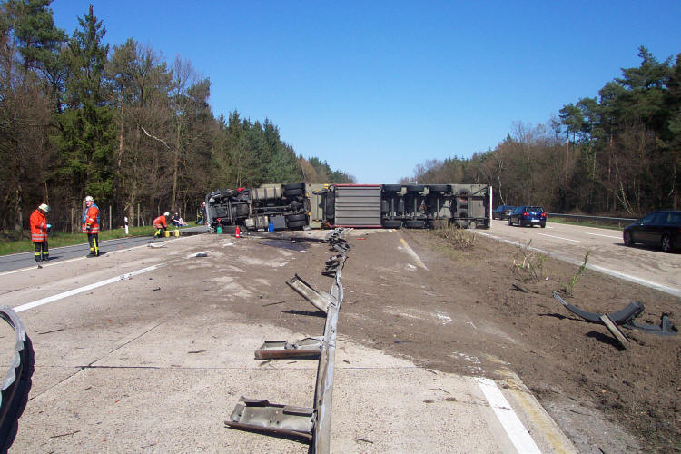 Dorfmark. Am Samstag gegen 13:55 Uhr kam es auf der Autobahn 7 zwischen Dorfmark und Soltau-Süd zu einem schweren LKW-Unfall. Durch einen geplatzten Reifen gegriet ein Schleswiger Lastwagen ins schleudern, durchbrach die Mittelleitplanke, kippte um und blieb schließlich quer auf der Gegenfahrbahn liegen. Durch glückliche Umstände fuhr kein anderes Fahrzeug in das plötzliche auf der Fahrbahn liegende Hindernis. Eine zufällig vorbeikommende Feuerwehreinheit aus Hamburg rettete den verletzten Fahrer aus seinem Fahrzeug, leistete Erste Hilfe und sicherten die Einsatzstelle ab. Austretende Kraftstoffe wurden von den alarmierten Einsatzkräften aus Dorfmark und Bad Fallingbostel aufgefangen oder abgestreut. Vor der Bergung des LKWs entfernten die 35 Brandschützer mit schwerem Gerät ca 150 Meter zerstörte Leitplanke von der Fahrbahn. Nach drei Stunden Bergung konnte die Fahrbahn schließlich zum Teil wieder freigegeben werden. Am Lastwagen entstand Totalschaden.