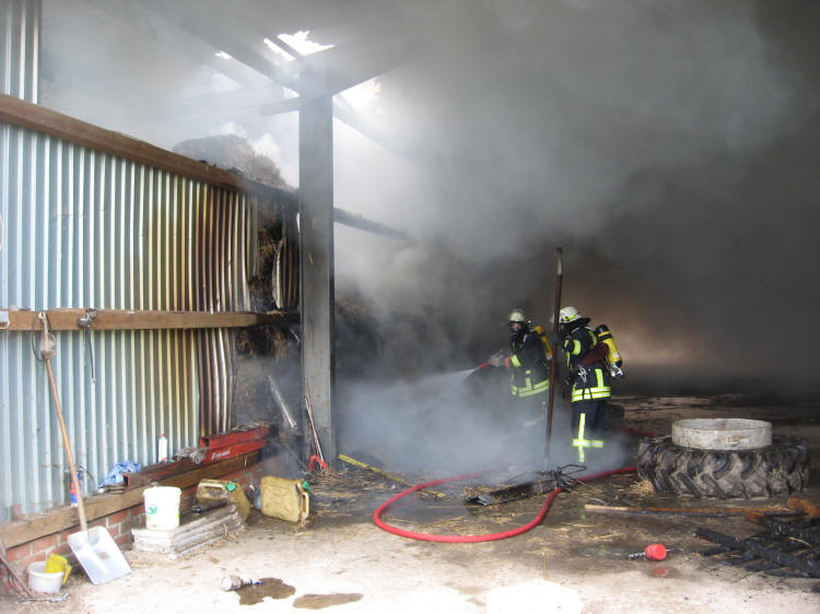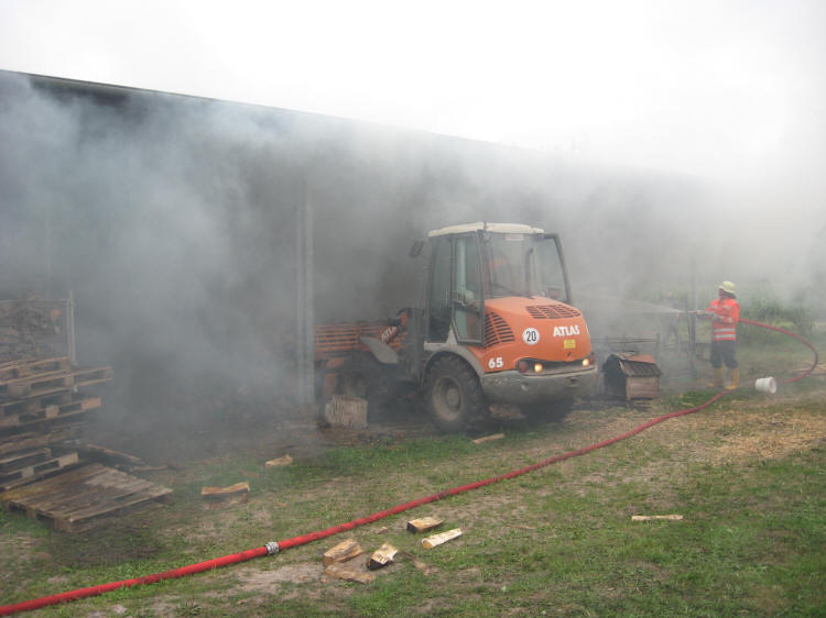Fulde (jf) Am Sonntagmorgen gegen 10:00 Uhr wurden die Feuerwehren Fulde und Walsrode zu einem Hallenbrand nach Fulde alarmiert. Bei Ankunft der ersten Einsatzkräfte war unter dem Vordach einer Maschinenhalle offenes Feuer und eine starke Rauchentwicklung feststellbar. Daraufhin wurden die Ortsfeuerwehren Ebbingen, Stellichten, Hünzingen und Hamwiede nachgefordert. Da die 45 Einsatzkräfte aus Fulde und Walsrode, die mit insgesamt fünf Fahrzeugen vor Ort waren, das Feuer aber schnell unter Kontrolle bringen konnten, musste die Verstärkung nicht mehr ausrücken. Insgesamt wurden bis zu 3 Strahlrohre, teilweise unter Atemschutz, vorgenommen. Mittels Radlader wurde das in Brand geratene Stroh und Holz aus dem Gebäude transportiert und abgelöscht. Es konnte aber nicht verhindert werden, dass das Dach und Teile der Aluminiumwand durchbrannten und so auch Schaden am Gebäude entstand. Die Nachlöscharbeiten der zuständigen Ortsfeuerwehr Fulde zogen sich bis in den späten Nachmittag hinein. Dazu wurde das Brandgut auf ein angrenzendes Feld transportiert und dort endgültig gelöscht. Neben dem Stadtbrandmeister Richard Meyer, seinen beiden Stellvertretern Volker Langrehr und Gerold Bergmann waren auch das DRK mit einem Rettungstransportwagen und die Polizei mit zwei Beamten im Einsatz.