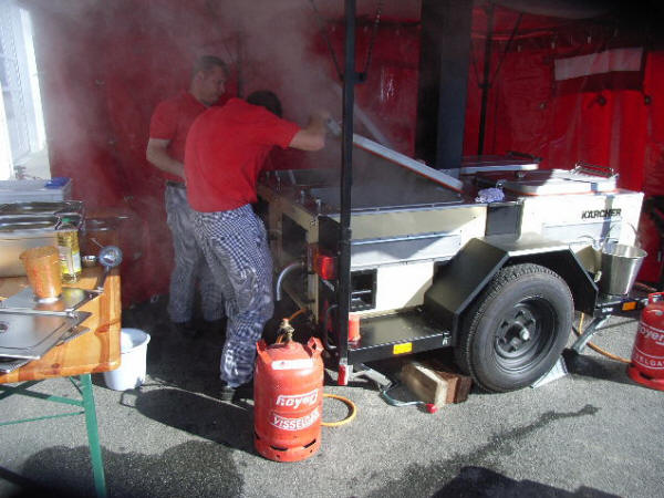 In Bleckede hatte der Fachzug Logistik in der Feldküche warmes Mittagessen zubereitet. Nach dem Start in den frühen Morgenstunden und den anstrengenden Einsatzlagen schmeckte es allen.