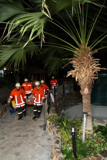 Die Mitarbeiterinnen und Mitarbeiter des Bades hatten viel Spaß als „Verletzte“ und legten gerne eine „Spätschicht“ für die Feuerwehr ein. Möglich wurde die seltene Gelegenheit, weil im Badeparadies derzeit Wartungsarbeiten durchgeführt werden.