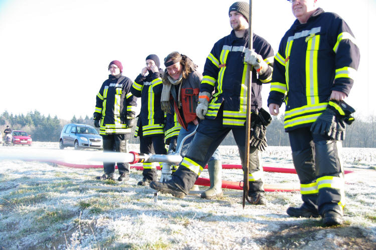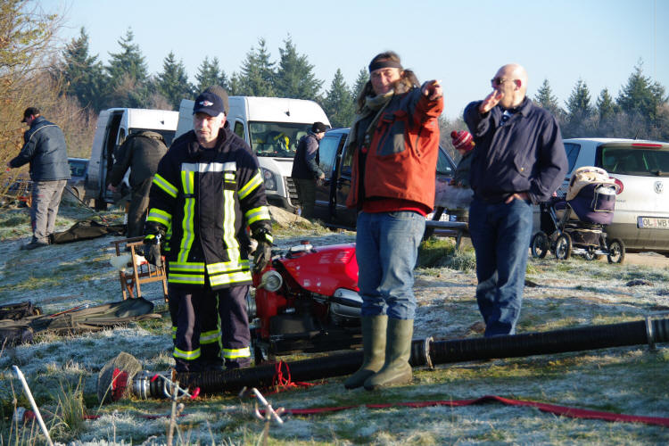 Schon seit mehreren Jahren hat die Feuerwehr Bomlitz, die Möglichkeit, wenn kein Angelbetrieb ist, am Borger See ihre jungen Maschinisten an den Pumpen weiter zu bilden. Dies haben auch die neuen Pächter Familie Nissler, von ihren Vorgängern übernommen. Am vergangenen Sonntag aber, war es anders herum. Familie Nissler brauchte die Hilfe der Feuerwehr. Sie hatten ein Angelevent organisiert, zu dem auch der aus der Fernsehsendung Fish`n`Fun bekannte Moderator, Auwa Thiemann eingeladen war, um sein enormes Angelwissen weiter zu geben. Dummerweise war am Morgen der Borger See, mit ca. 2cm dickem Eis überzogen. Die Feuerwehr brachte eine Tragkraftspritze in Stellung und mit Hilfe eines Wasserwerfers, wurde die Eisoberfläche gebrochen und das Eis zur Seemitte verschoben. Spontan entschloss sich Auwa die Bomlitzer Brandschützer zu unterstützen und stand auch für Fotos zur Verfügung.