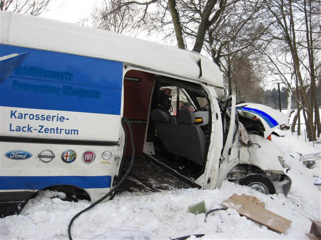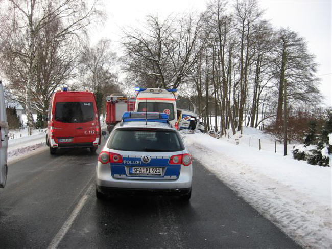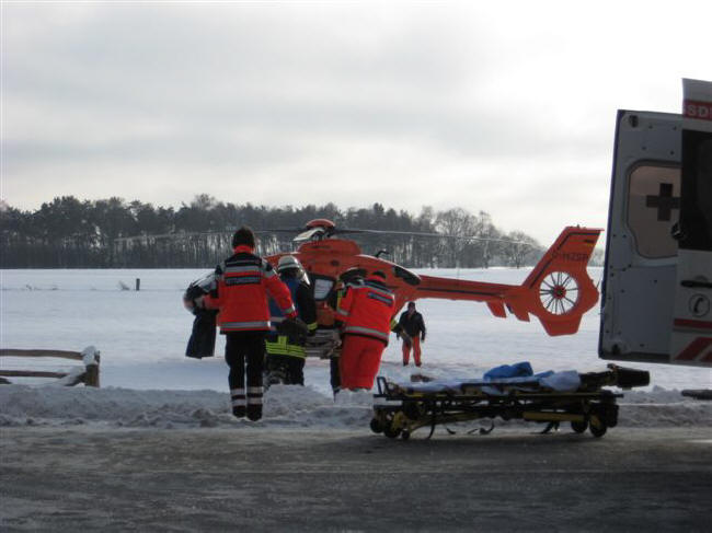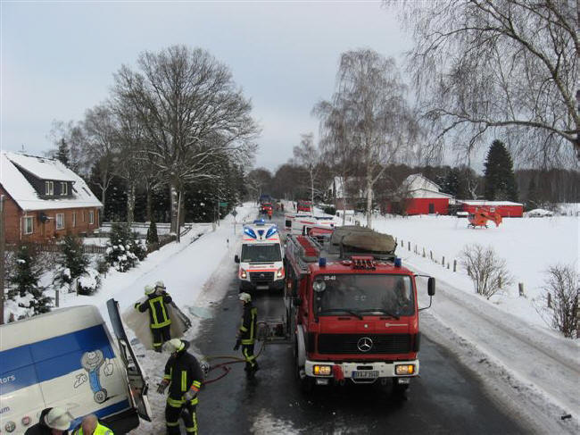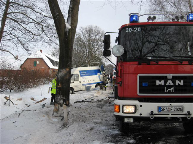 (jf) Die Freiwilligen Ortsfeuerwehren Fulde und Walsrode wurden am Dienstag um 11:47 Uhr zu einem schweren Verkehrsunfall nach Schneeheide gerufen. Dort war ein Klein-LKW, besetzt mit dem 42-jährigen Fahrer und seinem 4-jährigen Sohn, gegen einen Baum geprallt. Beide wurden im Fahrzeug eingeklemmt. Das Kind konnte schnell durch den Rettungsdienst befreit werden, der Fahrer, der durch den Aufprall auf die Ladefläche geschleudert wurde, musste mit der Rettungsschere durch die Feuerwehr befreit werden. Der kleine Junge wurde in das Heidekreisklinikum eingeliefert, der Vater wurde mit dem Rettungshubschrauber in die Medizinische Hochschule nach Hannover geflogen. Als Unfallursache gab die Polizei extreme Straßenglätte an, die dem Fahrer nach einem Überholmanöver zum Verhängnis wurde. Für die Arbeiten wurde die B209 in beiden Fahrtrichtungen gesperrt, die Einsatzstelle musste mit Salz abgestreut werden, um ein gefahrloses Arbeiten zu ermöglichen.  Am LKW entstand Totalschaden. Ebenfalls vor Ort war das Deutsche Rote Kreuz, die Johanniter Unfallhilfe sowie der Organisatorische Leiter Rettungsdienst mit vier Fahrzeugen und sieben Mitarbeitern und die Polizei mit vier Beamten und zwei Fahrzeugen. Die Feuerwehr war mit 24 Freiwilligen und fünf Fahrzeugen vor Ort.