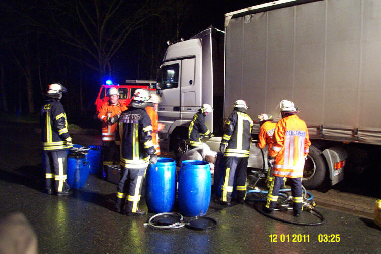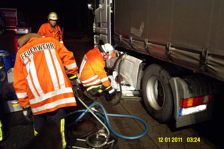 Am Mittwoch gegen 20:00 Uhr überfuhr ein LKW aus Hamburg eine Reifendecke auf der Autobahn 7 zwischen Soltau Süd und Dorfmark. Hierbei riß die Kraftstoffleitung und die Bremsluftleitung ab. Der Fahrer konnte noch das Fahrzeug auf dem Parkplatz "Steinbach" bei Dorfmark abstellen und informierte die Polizei. Nach dem Eintreffen der Polizei wurde festgestellt, dass Diesel aus dem Fahrzeugtank austrat. Die alarmierte Feuerwehr Dorfmark fing den ausgelaufenen Kraftstoff mit Bindemittel auf. Danach dichteten die 15 Einsatzkräfte die Dieselleitung ab und pumpten ca. 200 Liter Treibstoff in Auffangfässer. Eine Fachfirma reparierte den LKW wieder, so dass nach 2,5 Stunden die Brandschützer wieder einrücken konnten.