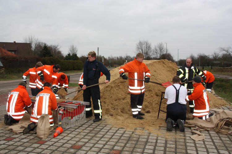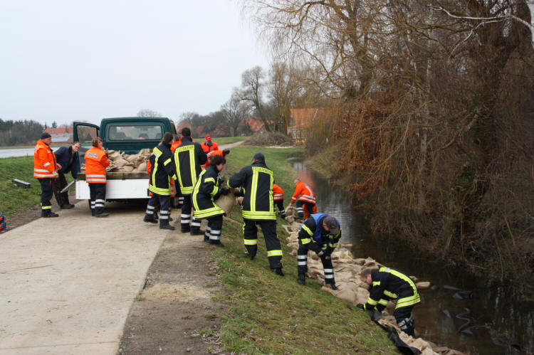 (bak) Als gegen 11.30 Uhr die Hodehagener Feuerwehrleute ihren Funkmelder mit dem Stichwort "Deichsicherungsmassnahme" alarmiert wurden, ahnten die freiwilligen Helfer zunächst nichts Gutes. Doch was erst so dramatisch schien, war lediglich die leichte Ausdehnung des bereits bekannten Deichschadens an der ortszugewandten Seite. Hier drang schon seit Tagen Quellwasser und nicht durch den Deich gesickertes Allerwasser heraus, und weichte den erst kürzlich neu gebauten Hochwasserschutz mit seiner frischen Grasnabe auf. Mit den nachalarmierten Nachbarwehren Hademstorf und Eickeloh wurden nunmehr an die 1000 Sandsäcke befüllt und im Pendelverkehr an die Einsatzstelle vis-a-vis der Straße "Auf dem Brink" gebracht. Hier stabilisierten die 40 Helfer auf etwa 60m Länge die aufgeweichte Deichrückseite, es bestand zu keiner Zeit das Risiko eines Deichbruches. Der Gemeindebrandmeister Thomas Zimmermann, Bürgermeister Karl-Gerhard Tamke, Samtgemeindebürgermeister Heinz-Günter Klöpper, sowie Vertreter des Deichverbands informierten sich ebenfalls vor Ort. Die etwa 40 Freiwilligen wurden am Sandverladeplatz, dem Hodenhagener Betriebshof, mit Getränken und einem kleinen Imbiss versorgt. Einsatzende war gegen 17 Uhr.