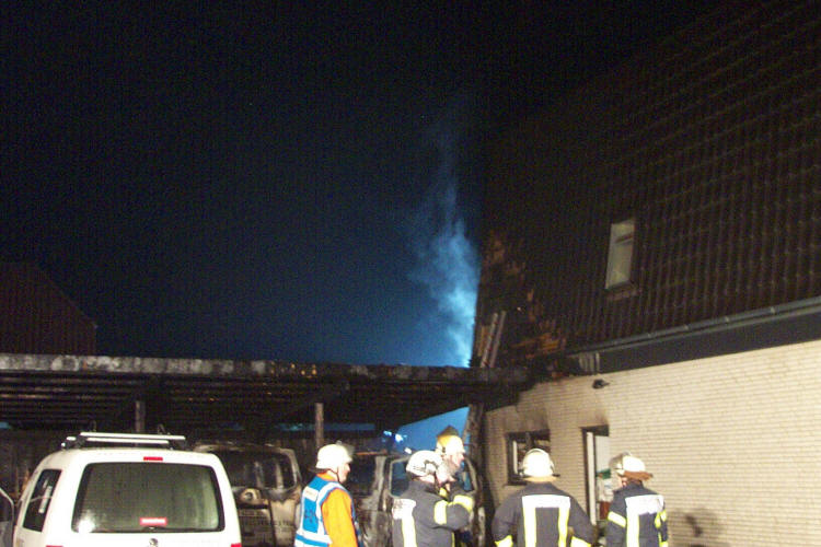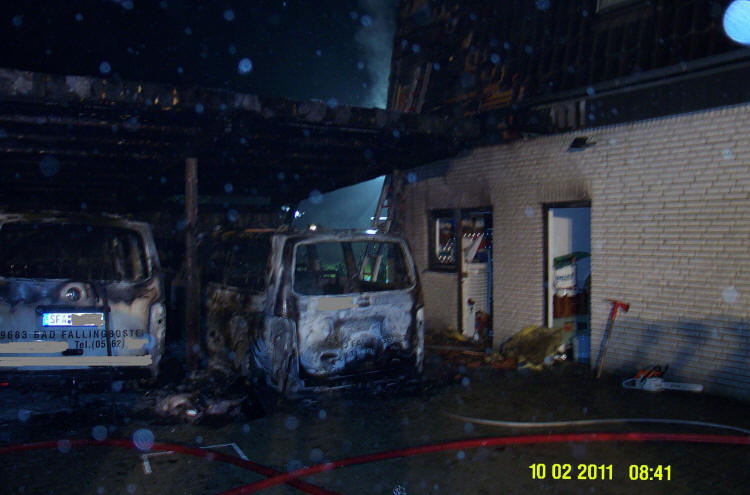 Am Freitag gegen 01:15 Uhr kam es aus bisher nicht geklärter Ursache zu einem Feuer in der Straße "Am Hamberg". Dort brannten mehrere Fahrzeuge, das Carport, sowie die Außenverkleidung des Wohnhauses. Die zuerst eintreffenden Einsatzkräfte der Feuerwehr Bad Fallingbostel ließen sofort Stadtalarm mit Sirene auslösen. Zusätzlich wurde die Ortsfeuerwehr Oerbke alarmiert. Die ca. 70 Einsatzkräfte bekämpften den Brand mit mehreren Rohren. Nach 15 Minuten war das Feuer unter Kontrolle, so dass die Brandschützer zum Glutnestersuchen mit der Wärmebildkamera übergehen konnten. Das Wohnhaus wurde mit zwei Überdrucklüftern vom Brandrauch befreit. Gegen 02:30 Uhr konnten die nachalarmierten Feuerwehren wieder abrücken. Die Brandnestersuche durch die Feuerwehr Bad Fallingbostel zog sich noch länger hin.