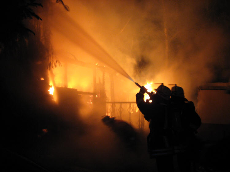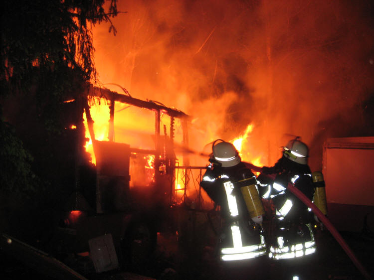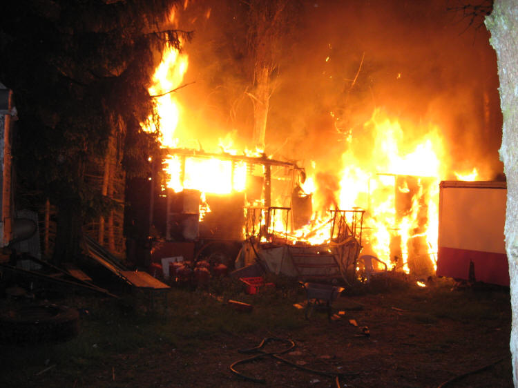 (jf) Die Freiwilligen Feuerwehren Hünzingen, Ebbingen und Walsrode rückten in der Nacht zum Freitag gegen 2.00 Uhr mit einem Großaufgebot zu einen Feuer nach Dreikronen aus. Dort war aus bisher unbekannter Ursache ein 2.5 x 10 Meter großer Wohnwagen in Brand geraten. Der Feuerschein war auf der Anfahrt bereits aus größerer Entfernung sichtbar, bei Ankunft der Freiwilligen stand der Holzwagen in Vollbrand. Unter Atemschutz wurden zwei Rohre vorgenommen und das Feuer bekämpft, ein Übergreifen auf weitere Wohn-und Schaustellerwagen konnte verhindert werden. Die Ehrenamtlichen brachten acht Gasflaschen aus dem Gefahrenbereich und kühlten sie, um ein Zerplatzen zu verhindern. Der Eigentümer berichtete, dass er durch Knallgeräusche auf den Brand aufmerksam geworden war, eigene Löschversuche mit zwei Feuerlöschern blieben erfolglos, daraufhin hatte er die Feuerwehr zu Hilfe gerufen. Am Fahrzeug entstand Totalschaden, die Ermittlungen der Polizei zur Schadenursache dauern an. Im Einsatz waren insgesamt 40 Feuerwehrmitglieder mit fünf Fahrzeugen sowie die Polizei mit sechs Beamten.