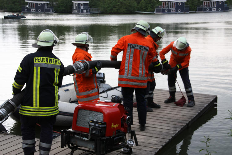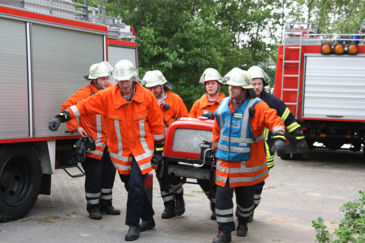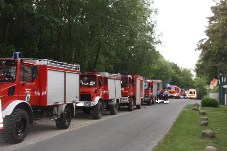 (jf) Am Donnerstag fand im CenterParcs Bispinger Heide eine gemeinschaftliche Großübung des Parkmanagements und der Freiwilligen Feuerwehr statt. Der Park verfügt über 681 Bungalows sowie 69 Hotelzimmer auf 100 Hektar Fläche, in denen bis zu 3500 Gäste untergebracht werden können. Es wurde angenommen, dass in den letzten sechs Wochen Temperaturen von 28° und Trockenheit mit Waldbrandgefahrenstufe 5 herrschte. Der Feuerwehrflugdienst war seit mehreren Tagen im Einsatz, die Feuerwehren der gesamten Polizeidirektion Lüneburg wurden in den letzten Tagen immer wieder zu kleineren Wald- und Flächenbränden alarmiert, die aber immer sehr schnell unter Kontrolle gebracht werden konnten. Am Donnerstagvormittag war es auf dem Truppenübungsplatz Munster Nord zu einem Flächen- und Waldbrand gekommen, der nicht unter Kontrolle gebracht werden konnte. Stark auffrischende Winde machten die Brandbekämpfung direkt auf dem Truppenübungsplatz fast unmöglich, so dass eine weitere Ausweitung des Feuers nicht ausgeschlossen werden konnte. Im CenterParcs Bispinger Heide war bereits starker Brandgeruch und leichter Ascheregen festzustellen. Einige Parkbesucher wurden unruhig und meldeten sich bei der Parkleitung. Ab 16.00 Uhr kam der Krisenstab des Parks mit der Kreisfeuerwehrführung zusammen, um die weiteren Schritte zu besprechen. Nachdem um 17:00 Uhr die Entscheidung zur Evakuierung von Teilbereichen des CenterParcs gefallen war, wurde der Kreisbereitschaftsführer Nord, Andreas Lüdemann, gegen 17:15 Uhr alarmiert. In der Zwischenzeit richtete sich die Technische Einsatzleitung BÖHME ein, um den Gesamteinsatzleiter, den Stellvertretenden Abschnittsleiter und Ortsbrandmeister Bispingen, Joachim Müller, zu unterstützen. Ab 17:22 Uhr wurden die Gäste aus dem Zentralbereich Market Dome inklusive des Hallenbades per Lautsprecherdurchsage informiert, dass sie aus Sicherheitsgründen den Bereich verlassen müssen. Die Evakuierung wurde durch Mitarbeiter des CenterParcs koordiniert und begleitet. Nach Einweisung des Kreisbereitschaftsführers in die Lage wurde die Kreisfeuerwehrbereitschaft Nord mit den Fachzügen Personal, Logistik, Technische Hilfeleistung, Wassertransport, Wassertransport WT25 (25 000 Liter Wasser) und Wasserförderung alarmiert. Somit befanden sich rund 200 Ehrenamtliche von Feuerwehr, THW und Rettungsdienst mit 40 Fahrzeugen im Einsatz. Die Fachzüge hatten mehrere Aufgaben, beispielsweise die strukturierte Evakuierung der Bungalowzonen, in denen sich noch Gäste aufhielten. Außerdem musste die Brandbekämpfung bei diversen Entstehungsbränden eingeleitet werden, es wurden Brandschneisen eingerichtet und Gebäude gegen Funkenflug geschützt. Da viel Löschwasser benötigt wurde, musste vom parkeigenen See die Wasserversorgung aufgebaut werden. Im See wurden Fässer mit chemischen Stoffen aus dem Hallenbad gefunden, die mittels Booten geborgen werden mussten. Nach rund zwei Stunden war die Übung beendet. Der Kreisbrandmeister Uwe Quante sowie diverse Stadt-und Gemeindebrandmeister waren vor Ort, um sich ein Bild der Arbeiten zu machen. Bei der nachfolgenden Manöverkritik gingen der Übungsleiter und Abschnittsleiter Nord, Thomas Ruß, der Gesamteinsatzleiter Joachim Müller, der Kreisbereitschaftsführer Andreas Lüdemann sowie der Sicherheitsverantwortliche des CenterParcs, Manfred Rademacher, auf die Herausforderungen und gemachten Erfahrungen ein. Festgestellte Mängel und Probleme können so beseitigt werden, um im Realfall effektiver helfen zu können. Im Anschluss wurden noch einige Mitglieder befördert, der Bereitschaftsführer Andreas Lüdemann zum Ersten Hauptbrandmeister, der Zugführer Jens Brokmann sowie Carsten Kühn zu Oberbrandmeistern.