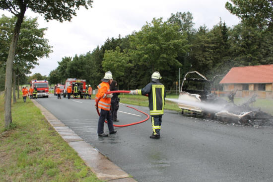 Der Fahrer stoppte das Fahrzeug um nachzusehen, als er an dem Anhänger ankam hatte sich das Feuer bereits auf den gesamten Wohnwagen ausgebreitet. Zusammen mit einem Passanten wurden die Gasflaschen geborgen und erste Löschversuche unternommen. Die eintreffenden Feuerwehren aus Westenholz, Krelingen und Ostenholz, die mit vier Fahrzeugen und 18 Kräften vor Ort waren, löschten den Wohnanhänger mit zwei Rohren.
