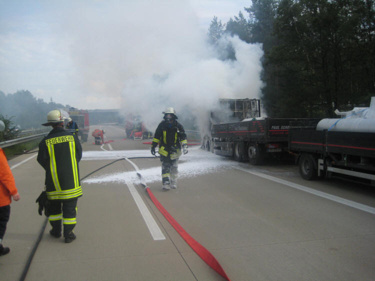 Die 28 Helfer die mit sechs Fahrzeugen auf die Autobahn ausrückten löschten das Feuer unter schwerem Atemschutz mittels Schaum. Die Fahrerkabine brannte vollständig aus. Nach Aussage des Fahrers gingen plötzlich alle Lampen und Lichter aus und es roch verschmort. Er konnte gerade noch seine Papiere und Sachen aus dem LKW holen, bevor Flammen aus dem Armaturenbrett schlugen. Die Ursache des Brandes ist noch ungeklärt. Die Autobahn musste während der Löscharbeiten teilweise gesperrt werden.