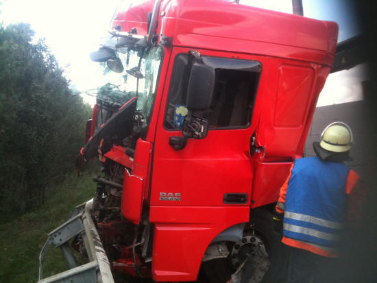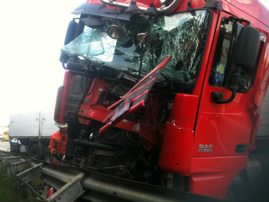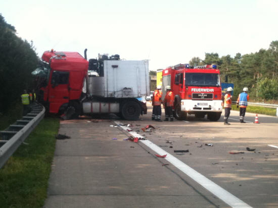 Am 19.09.2011 wurde um 15:37 Uhr die Feuerwehr Schwarmstedt zu einem Verkehrsunfall mit eingeklemmter Person alarmiert. Auf der A 7 (Fahrtrichtung Hannover) war zwischen den Anschlussstellen Schwarmstedt und Berkhof aus noch unbekannter Ursache ein LKW auf einen vorausfahrenden LKW aufgefahren. Der auffahrende LKW-Fahrer „verriss“ nach der Kollision sein Fahrzeug und kam in/an der Leitplanke zum Stehen. Durch die Wucht des Aufpralls war er dabei in seiner Fahrzeugkabine eingeklemmt worden und musste durch die alarmierten Einsatzkräfte mit Hilfe des hydraulischen Rettungsgerätes befreit werden. Nach ihrer Befreiung wurde die verunglückte Person an die vor Ort befindlichen Rettungskräfte übergeben. Ferner galt es große Mengen ausgelaufenen Kraftstoffes abzustreuen und den Dieseltank des LKW abzudichten. Darüber hinaus waren entsprechende Absperrmaßnahmen vorzunehmen. Neben drei Feuerwehrfahrzeugen mit insgesamt 17 Einsatzkräften waren außerdem zwei Rettungswagen, ein Notarzteinsatzfahrzeug sowie der Rettungshubschrauber Christoph 4 an der Einsatzstelle. Nach Befreiung der verunglückten Person und ersten Aufräumarbeiten wurde die Einsatzstelle an die vor Ort befindliche Polizei übergeben. Während der Einsatzarbeiten war die A7 in Höhe der Einsatzstelle voll gesperrt. Später wurde zunächst ausschließlich die linke Fahrspur von der Polizei wieder für den Verkehr freigegeben. Für die Einsatzkräfte der Freiwilligen Feuerwehr war der Einsatz um 17.00 Uhr beendet.
