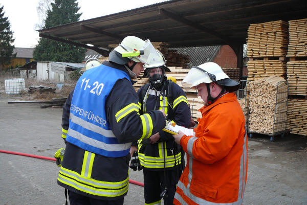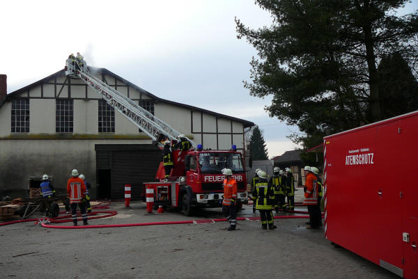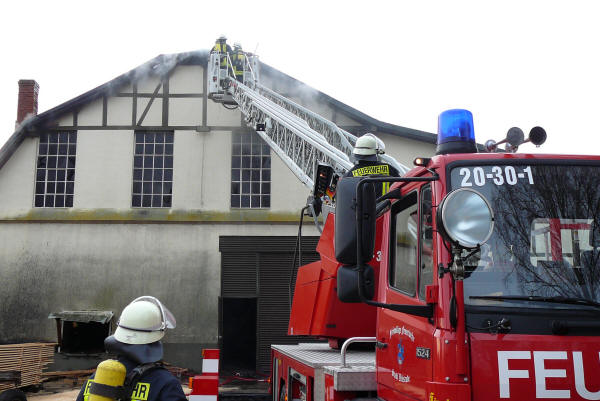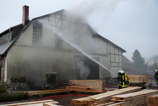 (jf) Bereits die Alarmierung am Freitag um 12.35 Uhr ließ nichts Gutes erahnen – F3 (Großbrand), eine Sägewerk in Grethem sollte brennen. Die ersten Helfer erkannten sofort, dass durch schnelles Handeln größerer Schaden verhindern werden kann. Daher wurde sofort Großalarm für alle Ortsfeuerwehren der Samtgemeinde Ahlden ausgelöst, zusätzlich rückte die Feuerwehr Walsrode mit der Drehleiter und einem Tanklöschfahrzeug an, genau wie die Ehrenamtlichen aus Gilten. Später kam noch die Feuerwehr Schwarmstedt mit der Schiebleiter zum Einsatz. Anfänglich war kein offenes Feuer zu sehen, nur eine starke Rauchentwicklung, die nahezu im gesamten Ort zu riechen war. Der Einsatzleiter, Gemeindebrandmeister Thomas Zimmermann, ließ mehrere Atemschutztrupps in den Innenangriff vorgehen. Dort suchten die Kräfte, teilweise auch mit der Wärmebildkamera, die Glutnester, die sich alle im Dachkonstruktionsbereich befanden. Mittels der Drehleiter wurden Teile des Daches entfernt und auch von oben gelöscht. Parallel wurden auch von mehreren Seiten weitere Rohre vorgenommen, um eine weitere Ausbreitung der Flammen zu verhindern. Da viele Atemluftflaschen verbraucht wurden, kam von der Feuerwehrtechnischen Zentrale (FTZ) Soltau noch der Abrollbehälter Atemschutz/Strahlenschutz in den Südkreis, um für Ersatz zu sorgen. Ebenfalls rückte noch ein Mitarbeiter der FTZ Schneeheide mit dem Schlauchwechselwagen an, um die nassen Schläuche zu tauschen. Da das Löschwasser sofort gefror, wurde das Betriebsgelände mit Sägespäne abgestreut. Während der Arbeiten war die Ortsdurchfahrt Grethem gesperrt, der Verkehr musste weiträumig umgeleitet werden. Zur Eigensicherung war die Johanniter Unfallhilfe vor Ort, so dass inklusive der Polizei rund 90 Helfer vor Ort waren. Der Kreisbrandmeister Uwe Quante, der Stellvertretende Abschnittsleiter Dieter Fricke sowie der Bürgermeister Heinz-Günter Klöpper machten sich ein Bild der Arbeiten. Die Ursache und Schadenhöhe sind unbekannt, die Ermittlungen der Polizei und des Brandschutzprüfers laufen. Glücklicherweise wurde niemand verletzt.