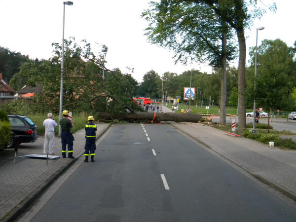 Nachdem am Sonnabend den 07.07.2012 bereits morgens ein Baum über einem Rad –und Fußweg in Cordingen beseitigt werden musste, wurde die Feuerwehr Bomlitz um 15:54 Uhr erneut zu einer technischen Hilfeleistung alarmiert. Ein Blitz war in eine große Eiche an der Cordinger Straße in Benefeld eingeschlagen.