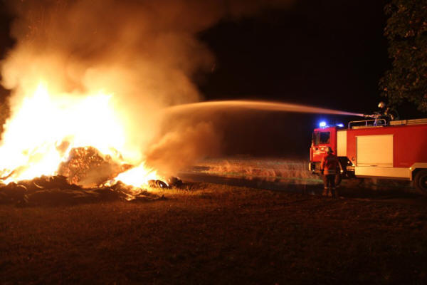 Das Stroh mußte aufwändig mit drei landwirtschaftlichen Schleppern und per Hand auseinandergezogen und abgelöscht werden. Die Brandursache ist noch unklar, die Polizei war bereits während der Löscharbeiten vor Ort und hat die Ermittlungen aufgenommen.