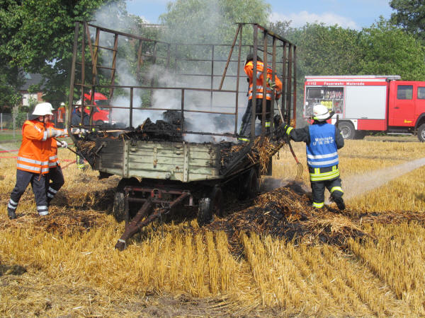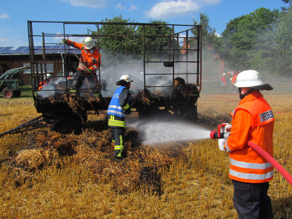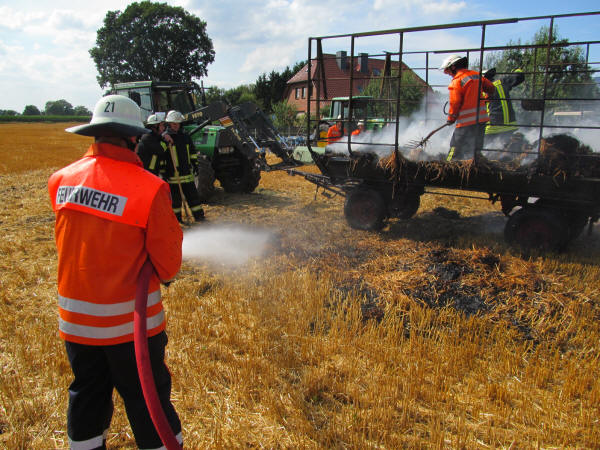 Am Nachmittag um 15:30 Uhr rückten die Ortsfeuerwehren Kirchboitzen, Groß Eilstorf, Südkampen, Altenboitzen und Walsrode aus, da in Kirchboitzen ein Anhänger mit Stroh brannte (siehe Fotos). Das Feuer konnte mit Wasser gelöscht werden, dazu musste das Stroh in mühsamer Handarbeit vom Hänger geworfen werden, was bei den hohen Temperaturen sehr anstrengend war.