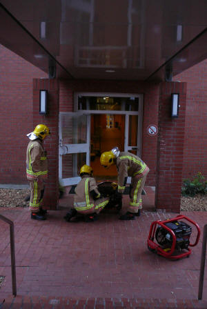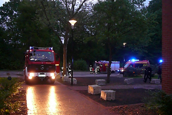(jf) Die Freiwillige Feuerwehr Bad Fallingbostel wurde am frühen Sonntagmorgen gegen 04.00 Uhr alarmiert, da die Brandmeldeanlage in der Kreisverwaltung des Heidekreises ausgelöst hatte. Bei Ankunft der Helfer war offenes Feuer innerhalb des Gebäudes zu erkennen. Erkundungen ergaben, dass es im Speisesaal sowie in der Poststelle brannte. Sofort wurde unter Atemschutz die Brandbekämpfung vorgenommen, die Flammen konnten schnell gelöscht werden. Ein größeres Problem war die starke Rauchentwicklung, die sich im gesamten Gebäude verteilte und zu einer großflächigen Verschmutzung führte. Da weitere Hochleistungslüfter benötigt wurden, kam auch noch die Ortsfeuerwehr Dorfmark sowie die englische Militärfeuerwehr (Fire Defense Service) zum Einsatz. Somit befanden sich rund 60 Helfer mit neun Fahrzeugen vor Ort. Des Weiteren machten sich der Kreisbrandmeister Uwe Quante, der Abschnittsleiter Hartmut Staschinski, der Brandschutzprüfer Folkard Boyer, der Landrat Manfred Ostermann sowie Karsten Mahler als Fachbereichsleiter ein Bild der Arbeiten.