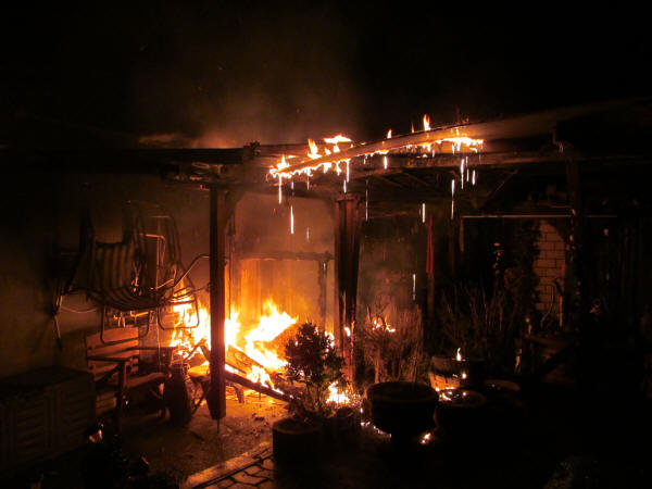 Um 02:56 Uhr dann ein erneuter Hilferuf aus der Bevölkerung. In der Bergstraße in Walsrode sollte ein Schuppen brennen. Bei Ankunft der Helfer stand eine Gartenlaube in Flammen, diese hatten auf eine Überdachung sowie einen Garagentrakt übergegriffen. Sofort wurde zum gefährdeten Bereich, weiteren Garagen und einem Wohnhaus, eine Riegelstellung eingerichtet. Dann erfolgte unter Atemschutz die Brandbekämpfung. Mittels Wärmebildkamera wurden die betroffenen Gebäudeteile auf Glutnester kontrolliert und das Garagendach teilweise geöffnet, um die letzten Brandnester zu löschen. Die rund 20 Ehrenamtlichen, die mit fünf Fahrzeugen vor Ort waren, konnten um 04:30 Uhr wieder einrücken.