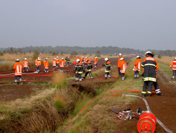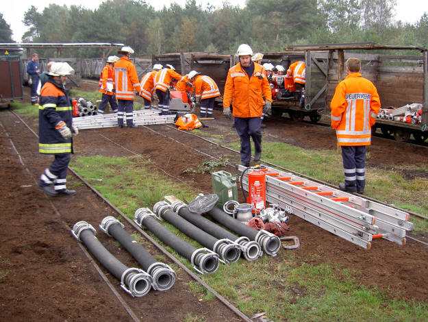 entfernte Einsatzgelände dar. Das Befahren des Moorgeländes mit den schweren Einsatzfahrzeugen war unmöglich, so dass sämtliches Gerät auf Loren einer Moorbahn umgeladen werden musste. So wurden Dutzende Schläuche, Pumpen und