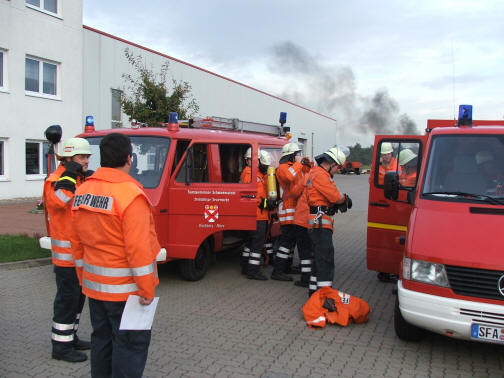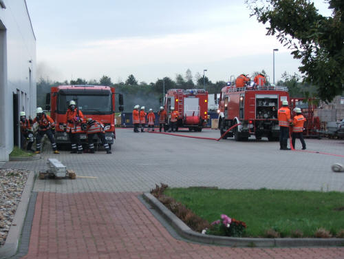 Einsatzleiter Bernd Wichmann bot sich folgende Lage: Durch einen Technischen Defekt entstand im Werkstattbereich ein Schwelbrand, der sich unbemerkt ausbreiten konnte. Eine Durchzündung sorgte dafür, das große Teile der Werkhalle und des angrenzenden Bürobereiches unmittelbar in Flammen standen. Nach Aussagen von Beschäftigten befanden sich zu diesem Zeitpunkt immer noch mehrere Personen im Gebäude. Daraufhin wurde sofort mit der Rettung der vermissten Personen begonnen. Mehrer Trupps unter Atemschutz drangen in das stark verqualmte Gebäude ein. Gleichzeitig wurde mit der Brandbekämpfung begonnen. Durch unglückliche Umstände konnten die beiden Feuerlöschbrunnen auf dem Betriebsgelände nicht benutzt werden. So mussten die Feuerwehrkräfte eine mehrere hundert Meter lange Schlauchleitung verlegen, um die Wasserversorgung sicherzustellen. Durch Schaulustige kam es während des Einsatzes zu einem weiteren Zwischenfall. Ein PKW mit zwei Insassen fuhr ungebremst unter einen LKW. Sofort waren Kräfte der Feuerwehr Schwarmstedt und der JUH zur Stelle um die Verletzten mit Hilfe von hydraulischen Rettungsgerät zu befreien. Nach 90 Minuten konnte „Feuer aus“ gemeldet werden.