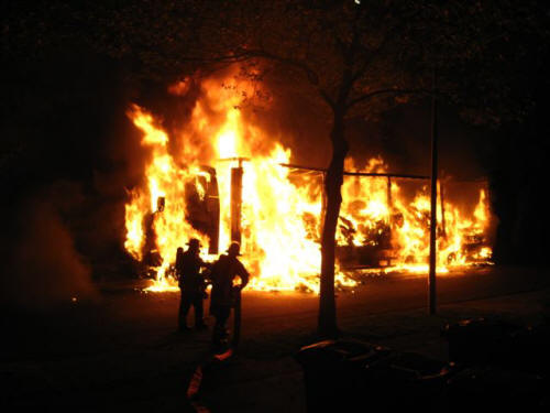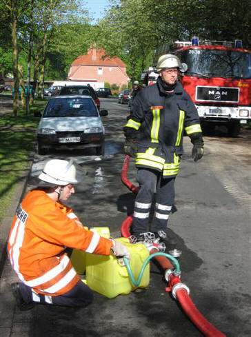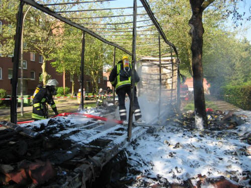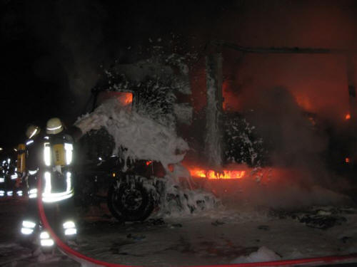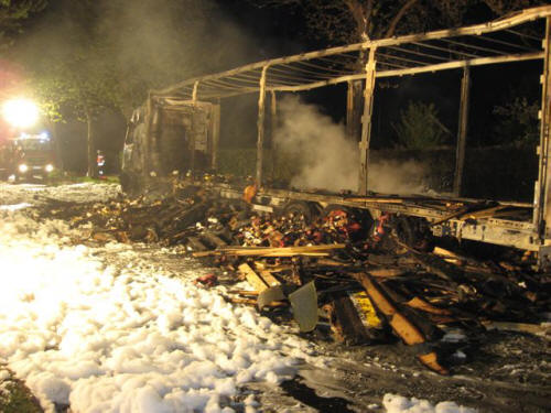 Walsrode (jf) Kurz nach 2:00 Uhr wurden die Hilfskräfte durch die Feuerwehreinsatzleitstelle Soltau mit dem Alarmstichwort "Brennt LKW" alarmiert. Bereits auf der Anfahrt zum Feuerwehrhaus konnten die Einsatzkräfte den Feuerschein sehen und das Knallen der platzenden Reifen wahrnehmen. Daraufhin rückten sie mit einem Großaufgebot an Helfern in den Dürerring aus. Bereits wenige Minuten später konnte die Brandbekämpfung mittels Schaum unter Atemschutz beginnen, was von zahlreich herbeigeeilten Schaulustigen verfolgt wurde. Die starke Wärmestrahlung sowie die Rauchentwicklung behinderten anfänglich die Löscharbeiten des mit Schleifpapierscheiben, Fettdosen und weiterem Stückgut beladenen Lastwagens. Auslaufender Dieselkraftstoff vermischte sich mit dem Löschwasser und lief über die Kanalisation in die Böhme. Daraufhin wurden weitere Kräfte nachalarmiert, um in Höhe der Böhmebrücke in Benzen eine Ölsperre zu setzen. Nach Rücksprache mit dem Vertreter der Unteren Wasserbehörde war diese Maßnahme aber nicht mehr nötig, da ein Großteil des Kraftstoffes bereits direkt an der Einsatzstelle mit Sandwällen und Kanaldichtkissen abgefangen und von einer Privatfirma aufgenommen werden konnte. Insgesamt waren rund 85 Helfer der Feuerwehren Walsrode, Honerdingen, Düshorn und Benzen, der Stadtbrandmeister, der Brandschutzprüfer und Kreisschirrmeister des Landkreises sowie Mitarbeiter des Deutschen Roten Kreuzes, der Polizei, des Bauhofes und einer Privatfirma vor Ort. Gegen 9:00 Uhr musste die Feuerwehr noch einmal anrücken, um verbliebene Glutnester abzulöschen. Als Ursache für den nächtlichen Großeinsatz kann Brandstiftung nicht ausgeschlossen werden, die Ermittlungen dauern zur Zeit noch an, die Einsatzstelle wurde von der Polizei beschlagnahmt. Am Fahrzeug und der Ladung entstand Totalschaden.