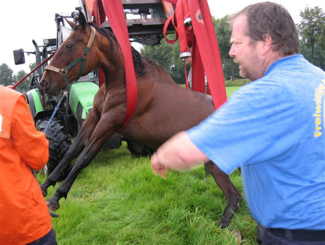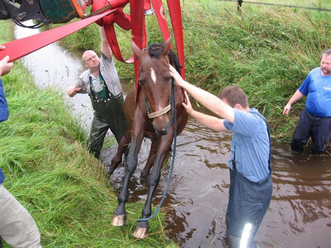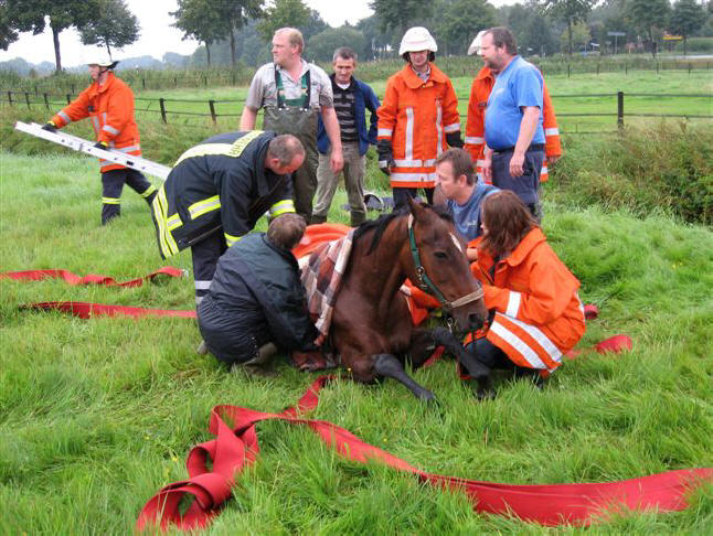 Beide Tiere mussten aus Gewässern gerettet werden. Das Pferd „Maletta“, ein 27 Jahre altes Pony war in den Sauerbach in der Gemeinde Wietzendorf geraten. Bis zum Eintreffen der Feuerwehr versorgten die Besitzer es vorbildlich und scheuten sich nicht, sofort ins Wasser zu springen, es mit Jacken zu wärmen und den Kopf über Wasser zu halten. Die Feuerwehr Wietzendorf konnte es mit Hilfe des Frontladers eines Treckers und zwei B-Schläuchen als Hebegurte aus dem Wasser ziehen. Drei Retter begaben sich dazu ebenfalls ins Wasser. Durch Steckleitern wurde ein sicherer Zugang über die steile Böschung hergestellt. Eine Tierärztin versorgte das Pferd. Kurze Zeit später konnte es schon wieder aufstehen. Die gesamte Rettung ließ das Pferd ruhig über sich ergehen.