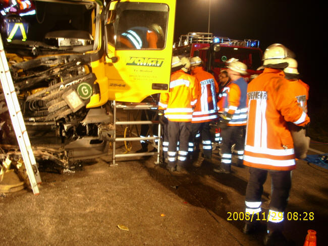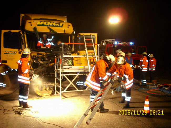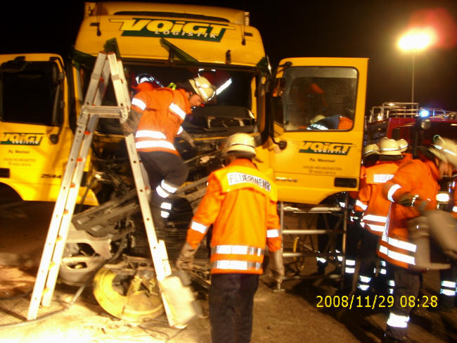 Am frühen Morgen des 29. November 2008 war auf der A7 – Höhe Allertal in Richtung Westenholz – ein LKW auf einen Streuwagen der Autobahnmeisterei aufgefahren. Durch die Wucht des Aufpralles verzog sich die Fahrerkabine des LKW dabei so stark, dass der Fahrer von ihr eingeklemmt wurde und nicht mehr aus dem verunfallten Fahrzeug befreit werden konnte. Um 06:37 Uhr wurde daher die freiwillige Feuerwehr Schwarmstedt zur Rettung der eingeklemmten Person alarmiert. Mit insgesamt fünf Fahrzeugen und 24 Einsatzkräften rückte die Feuerwehr aus. Zwei weitere Einsatzkräfte hielten sich im Geräthaus in Bereitschaft. Vor Ort wurde die Unfallstelle abgesichert und ausgeleuchtet. Ferner wurde der LKW durch entsprechende Unterlegkeile gegen Wegrollen gesichert und der Brandschutz sichergestellt. Mit dem hydraulischen Rettungsgerät (Schere, Spreizer, Stempel) begannen die Einsatzkräfte der Feuerwehr mit der Rettung des verletzten LKW Fahrers. Hierzu wurde von der Feuerwehr außerdem – um die Höhenunterschiede auszugleichen und den Fahrer sicher aus der Kabine befreien zu können – eine Rettungsplattform aufgebaut und Steckleitern in Stellung gebracht. Nachdem der Fahrer nicht mehr eingeklemmt war, wurde er von den Einsatzkräften mittels einer Schaufeltrage aus der Fahrerkabine befreit und den medizinischen Rettungskräften übergeben. Während der Rettungsarbeiten der Feuerwehr wurde der LKW Fahrer ständig von den vor Ort befindlichen medizinischen Einsatzkräften versorgt. Die Johanniter Unfallhilfe und das DRK selbst waren mit insgesamt zwei Rettungswagen und einem Notarzteinsatzfahrzeug vor Ort.