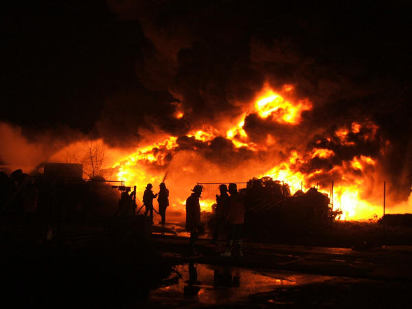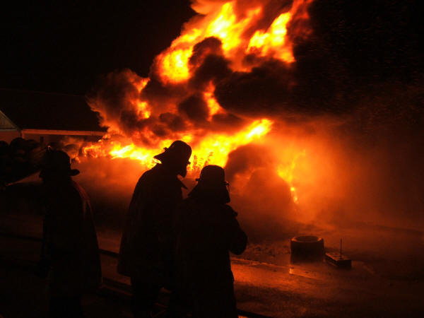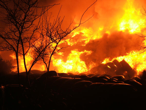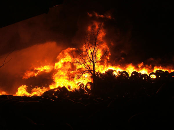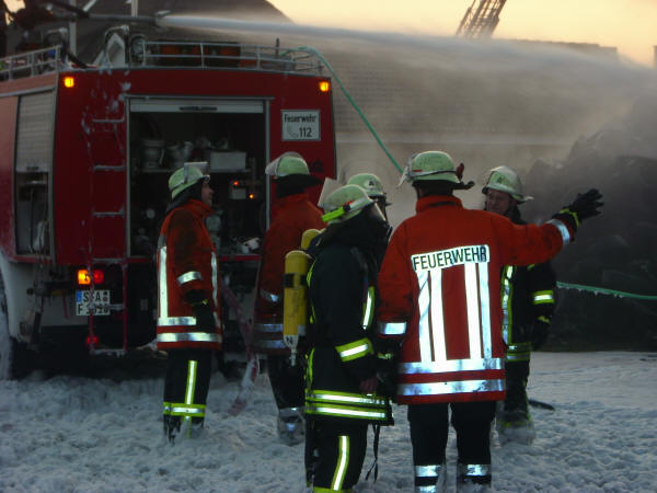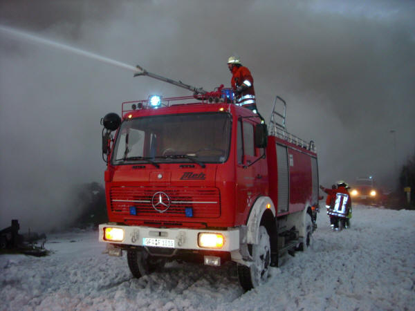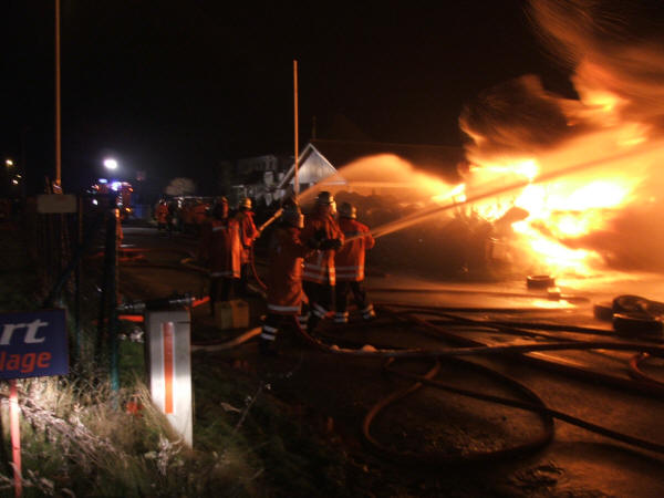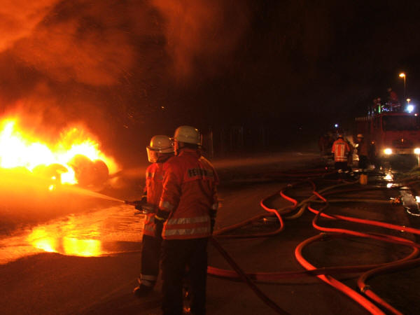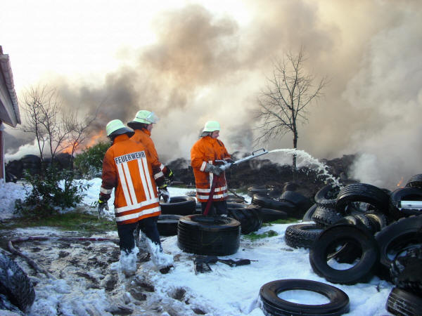 Gegen 3.13 Uhr in der Nacht zu Sonntag meldeten Anwohner ein Feuer im Gewerbegebiet Buchholz. Die Einsatzleitstelle in Soltau alarmierte sofort die Feuerwehren Buchholz und Schwarmstedt. Den ersten eintreffenden Einsatzkräften bot sich folgende Lage: Auf einer Fläche von ca. 3000 Quadratmetern brannten mehrer hundert Tonnen Altreifen in voller Ausdehnung. Eine angrenzende Lagerhalle, in der sich auch Altreifen befanden, stand ebenfalls in Flammen. Die Einsatzleitung erkannte sofort das Ausmaß des Feuer und ließ den Rest der 11 Ortsfeuerwehren der Samtgemeinde Schwarmstedt nachalarmieren. Von vier Unterflurhydranten und drei Löschwasserbrunnen aus wurde eine Wasserversorgung zur Einsatzstelle aufgebaut. Zeitgleich begangen mehrere Trupps unter Atemschutz mit der Brandbekämpfung und der Abriegelung benachbarter Gebäude. Da zur Bekämpfung des Feuers vorwiegend Schaum eingesetzt wurde, war abzusehen das der Vorrat an Schaummittel nicht ausreichen wird. Einsatzleiter Rainer Priebe fordert deshalb über die FEL weitere Behälter mit Schaummittel aus dem Tanklager der Bundeswehr in Hodenhagen, von der Berufsfeuerwehr Hannover und der Flughafenfeuerwehr Langenhagen an. Zur Unterstützung der Löscharbeiten wurde aus Mellendorf die Drehleiter angefordert. Über der Einsatzstelle bildete sich eine riesige Rauchwolke, die sich schnell in westlicher Richtung ausbreitete. Der Fachzug „Spüren und Messen“ der Kreisfeuerwehr führte deshalb parallel zu den Löscharbeiten an verschiedenen Stellen in der näheren Umgebung Schadstoffmessungen durch. Auf Grund der starken Rauchentwicklung wurde die Bevölkerung in Buchholz, Essel, Bothmer und Schwarmstedt durch Lautsprecherdurchsagen aufgefordert vorsorglich Fenster und Türen geschlossen zuhalten. Landrat Ostermann, Samtgemeindebürgermeister Frische und Kreisbrandmeister Quante machten sich persönlich vor Ort ein Bild von Lage. Insgesamt waren rund 220 Feuerwehrleute, sowie Kräfte der Polizei und der Johanniter Unfallhilfe mit 38 Fahrzeugen im Einsatz. Um das Feuer einzudämmen wurden ca. 15000 Liter Schaummittel eingesetzt.