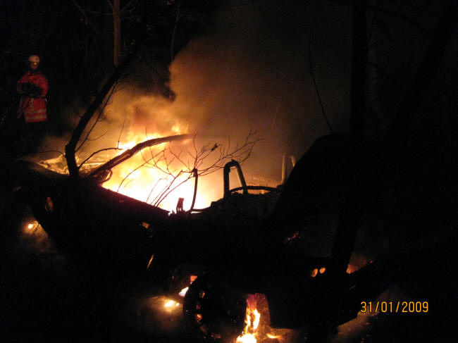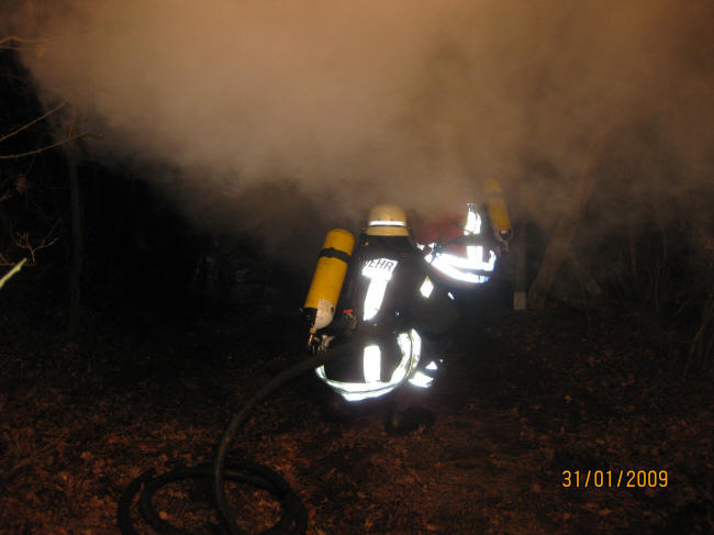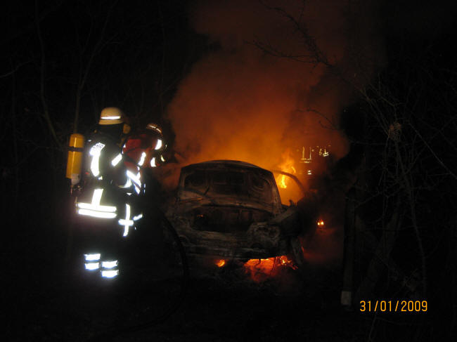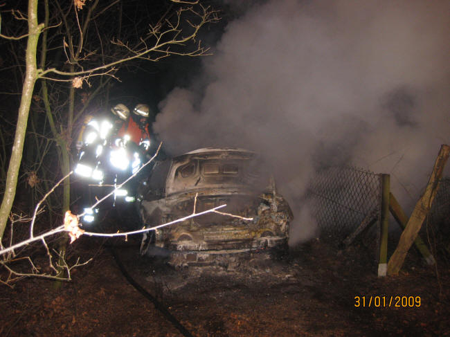 Am 31.01.2009 wurden um 23:20 Uhr die Ortswehren Schwarmstedt und Essel zu einem PKW Brand alarmiert. In einem Waldstück nahe der B 214 war zunächst eine Explosion wahrgenommen und daraufhin die Polizei und Feuerwehr alarmiert worden. Wie sich herausstellte, rührte diese Explosion von einem brennenden PKW her.Als die Einsatzkräfte an der Einsatzstelle eintrafen, stand das Fahrzeug – ein BMW Z 4 – bereits vollständig in Flammen. Der Brand wurde – auf Grund der starken Rauchentwicklung – von einem Trupp unter Atemschutz bekämpft. Zusätzlich wurde die Brandstelle großräumig ausgeleuchtet. Mittels Schnellangriffsschlauch aus dem Löschgruppenfahrzeug der Feuerwehr Schwarmstedt und unter Verwendung eines Hohlstrahlrohres und einer Schaumpistole wurde das Feuer durch den eingesetzten Angriffstrupp zügig abgelöscht. Am Fahrzeug entstand Totalschaden. Ein Flammenübergriff auf das Waldstück konnte durch den schnellen Feuerwehreinsatz verhindert werden. Die Löschwasserversorgung wurde durch das anwesende Löschgruppenfahrzeug sichergestellt. Einer gesonderten Löschwasserversorgung bedurfte es nicht.