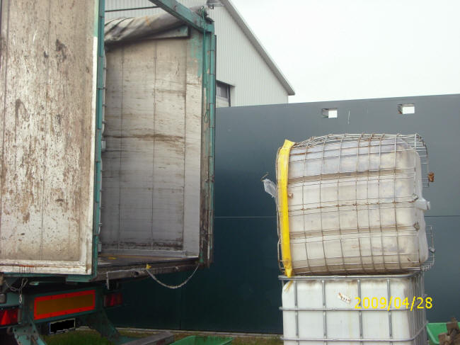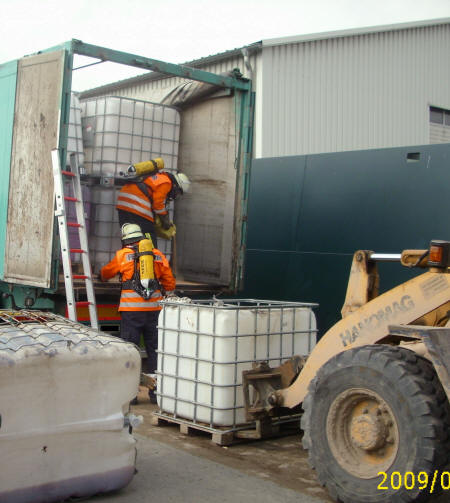 Unter den vorgeschriebenen Schutzmaßnahmen gingen die Einsatzkräfte nun vor und öffneten die Ladefläche des LKW. Anschließend begann man mittels Radlader damit, die geladenen 1000 Liter Behälter abzuladen um den oder die leckgeschlagenen Behältnisse ausfindig machen zu können. Nachdem festgestellt wurde, dass lediglich ein Behälter Flüssigkeit verloren hatte, wurde dieser abgedichtet, die ausgelaufene Flüssigkeit mit Bindemittel abgestreut und aufgenommen sowie die Ladefläche gründlich gereinigt. Im Anschluss hieran wurden die entladenen und ebenfalls gereinigten Behälter wieder auf die Ladefläche aufgeladen und der Einsatz, nachdem weitere Gefahren ausgeschlossen werden konnten, für beendet erklärt.