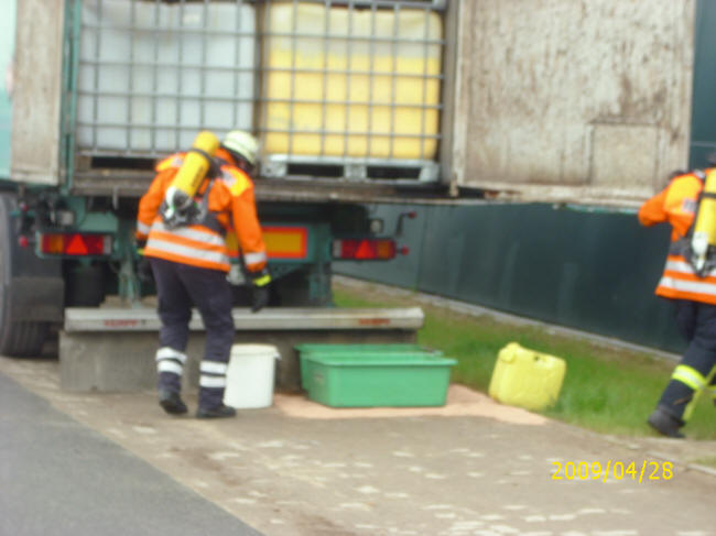 Am 28.04.2009 wurde die Feuerwehr Schwarmstedt am frühen Morgen zur Aufnahme von auslaufenden Flüssigkeiten alarmiert. Im Gewerbegebiet Schwarmstedt rann aus dem Auflieger eines als Gefahrguttransporter gekennzeichneten LKW eine unbekannte Flüssigkeit nach außen.