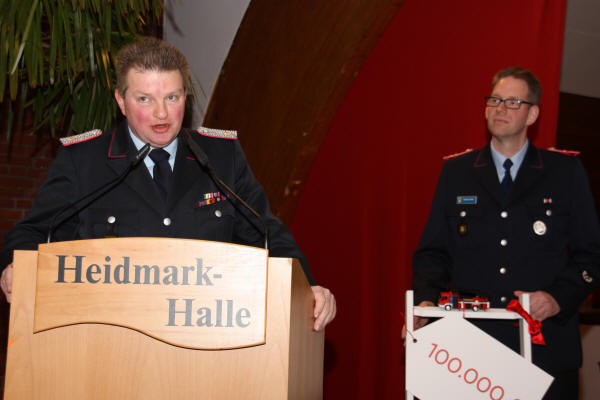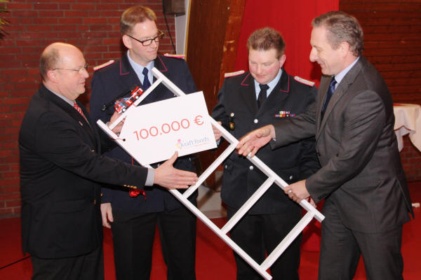 Das Beste kommt immer zum Schluss: Mit einem Paukenschlag endete die Jahreshauptversammlung der Freiwilligen Feuerwehr Bad Fallingbostel am Sonnabend. Denn Carsten Boldt, Werksleiter von Kraft Foods, bedankte sich nicht nur bei den Helfern für die Einsatzbereitschaft beim Unfall auf dem Werksgelände im Oktober. Boldt sagte auch: „Alle haben ehrenamtliche und professionelle Hilfe geleistet und so dazu beigetragen, dass der Einsatz glimpflich verlief. Aus diesem Grund haben sich die Verantwortlichen von Kraft Foods dazu entschieden, einen Beitrag in Form von 100.000 Euro als zweckgebundene Spende zum Hubrettungsfahrzeug zu leisten.“ Stadtbrandmeister Thomas Tödter und Ortsbrandmeister Stefan Radloff zeigten sich daraufhin sprachlos.