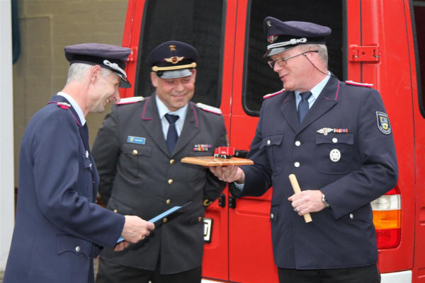 Dort war der Grill bereits mit Fleisch und Wurst belegt. Vorher erhielt Volker von Alm noch einen Gutschein zum Essen in einem schicken Restaurant und ein Modell des Einsatzleit-Fahrzeuges, in dem er mit „seiner“ TEL einige Stunden und Tage bei Übungen und Einsätzen zugebracht hat.