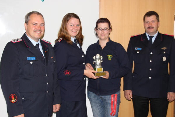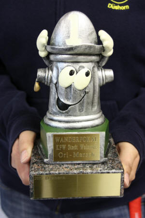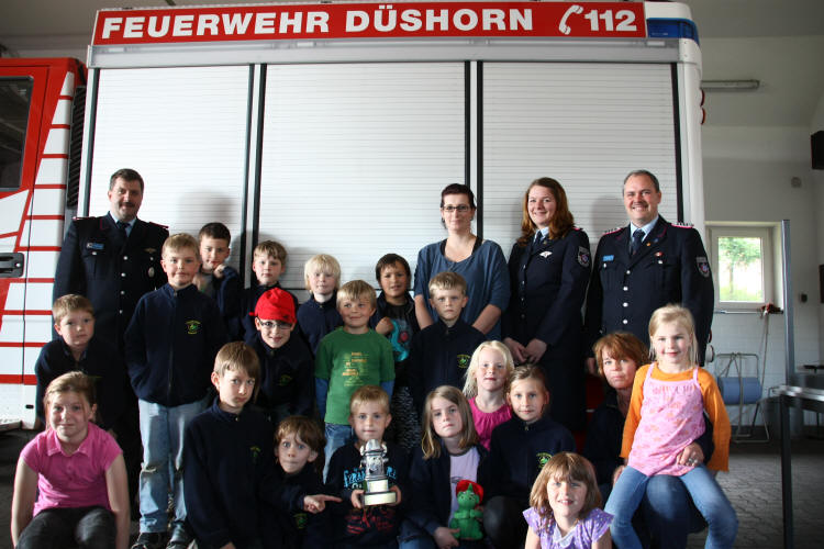 (jf) Der Ortsbrandmeister der Freiwilligen Ortsfeuerwehr Düshorn, Frank Schmidt, hat für die Kinderfeuerwehren im Stadtgebiet Walsrode einen Wanderpokal für den alljährlich stattfindenden Orientierungsmarsch gestiftet. „Die Kinderfeuerwehren waren so enttäuscht, weil sie beim letzten Orimarsch nur Urkunden bekommen haben, da habe ich mich entschlossen einen Pokal zu stiften“, so Schmidt. Am letzten Freitag war es soweit - die Kinderfeuerwehr Düshorn war mit 18 Kindern im Feuerwehrhaus, um dort zu übernachten. Mit einem Überraschungsbesuch durch den Stadtjugendfeuerwehrwart Olaf Schimmelpfennig, seine Stellevertreterin Mareike Dopmann und den Ortsbrandmeister Frank Schmidt hatten sie nicht gerechnet. Der Pokal wurde an Kerstin Schwanke und Brigitte Treptow überreicht, weil die Düshorner Kids beim letzten Orientierungsmarsch den ersten Platz belegt hatten. Die Nachwuchsbrandschützer und Betreuer waren begeistert und freuten sich riesig über die Überraschung. Im kommenden Jahr werden sie sich besonders anstrengen, um ihn behalten zu können, ansonsten wandert er an eine andere Kinderfeuerwehr aus dem Stadtgebiet.