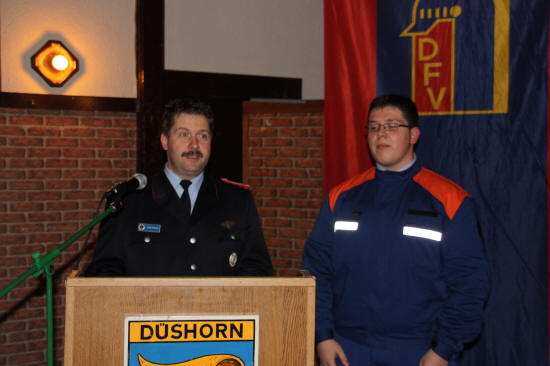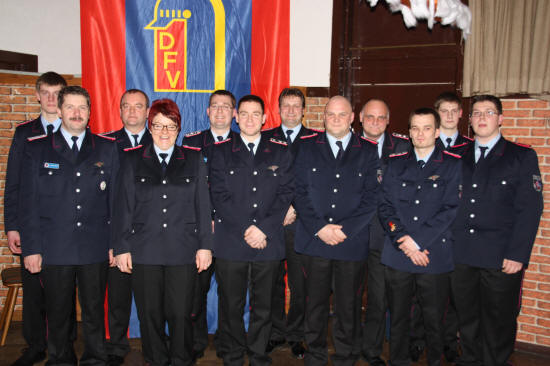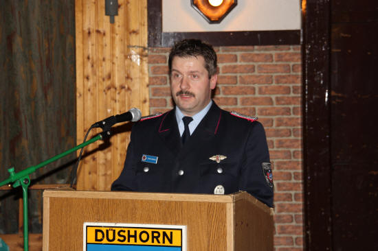 (jf) Zahlreiche Mitglieder, aber auch Gäste von befreundeten Organisationen und Verbänden, waren der Einladung des Ortsbrandmeisters gefolgt und nahmen am vergangenen Wochenende an der Jahreshauptversammlung teil. In seinem Jahresrückblick ging Frank Schmidt auf das neue Löschgruppenfahrzeug (LF) 10/6 ein, welches für die 62 Aktiven einen Quantensprung bei der Technik bedeutete. Das Fahrzeug hat bereits bei vielen Einsätzen wertvolle Arbeit geleistet und vervollständigt den Fuhrpark neben dem Mannschaftstransportfahrzeug und dem Krad „Maiko“ – auch eine Besonderheit der Düshorner Ortsfeuerwehr. Insgesamt hatten die Ehrenamtlichen 17 Einsätze abzuarbeiten, darunter 10 Brandeinsätze und sieben Hilfeleistungseinsätze. Es mussten Großbrände gelöscht und Menschen aus verunfallten Fahrzeugen befreit werden, aber auch der Fehlalarm einer Brandmeldeanlage tauchte in der Statistik auf. Neben den Aktiven bestand die Ortsfeuerwehr Düshorn im Berichtsjahr aus 18 Mitgliedern in der Altersabteilung, 23 in der Jugendabteilung sowie 26 in der neu gegründeten Kinderfeuerwehr, 424 Förderer unterstützen die Arbeit ihrer Feuerwehr. Als Neuerung gab Schmidt bekannt, dass das Osterfeuer 2011 erstmalig am Ostersamstag stattfinden wird. Im Bericht der Jugendwartin ging Mareike Fieweger noch einmal auf ein ereignisreiches Jahr ein, in dem auch das 40-jährige Jubiläum begangen wurde. Erstmalig konnte die Leiterin der „Düshorner Löschknirpse“, Kerstin Schwanke, von den Aktivitäten der Kinder berichten. Es wurden 15 Dienste absolviert, drei Mitglieder konnten bereits an die Jugendfeuerwehr abgegeben werden – ein wichtiger Beitrag für die Nachwuchssicherung. Im Rahmen des Fachzuges „Messen und Spüren“ der Kreisfeuerwehr hatten die Düshorner 10 Dienste und drei Einsätze zu leisten, ebenfalls waren sie mit dem „Fachzug Logistik“ mehrfach im Einsatz. Aber auch die Altersgruppe war weiterhin aktiv, trotz des Durchschnittsalters von 72 Jahren wurden wichtige Leitungen für die Feuerwehr erbracht. Nach zwei Sketchen, aufgeführt von Mitgliedern der Jugendfeuerwehr, wurden folgende Beförderungen und Ehrungen durchgeführt :