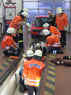 (jf) Der Stellvertretende Ortsbrandmeister und designierter Nachfolger von Andreas Bergmann, Michael Schlüter, hatte sich zur Verabschiedung des scheidenden Ortsbrandmeisters etwas Besonderes einfallen lassen. Gegen 17.54 Uhr ließ er die Ortsfeuerwehr zu einer Hilfeleistung alarmieren. Bei einem Unternehmen in der Uetzingerstrasse musste das DRK bei einer Personenrettung unterstützt werden. Dort war ein Mitarbeiter in eine Grube gestürzt und hatte sich dabei verletzt. Die Situation war so real nachgestellt, dass der Einsatzleiter Bergmann sowie die nicht eingeweihten Freiwilligen von einem Ernstfall ausgingen. Erst nach und nach wurde klar, dass es sich um eine „Abschlußübung“ handelte. Die Lage wurde professionell abgearbeitet und der Verunglückte konnte nach kurzer Zeit aus der misslichen Lage befreit und an den Rettungsdienst übergeben werden. Danach wurde im Feuerwehrhaus eine Überraschungsfest mit weiteren Gästen, darunter den Ortsbrandmeistern der Nachbarfeuerwehren, Vertretern der Kreisfeuerwehrbereitschaft und der Altersgruppe, der Kirche und anderen Vereinen, gefeiert. Michael Schlüter dankte Andreas Bergmann und seiner Frau Kerstin und überreichte einen Reisegutschein. Auch der Stadtbrandmeister Richard Meyer ließ es sich nicht nehmen, Bergmann für die geleistete Arbeit zu danken. Dieser wird der Feuerwehr aber Bereitschaftsführer der Kreisfeuerwehrbereitschaft Süd erhalten bleiben.