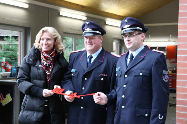 Vor Übergabe der beiden Schlüssel an den Stadtbrandmeister Richard Meyer und den Ortsbrandmeister Dieter Fricke sagte die Bürgermeisterin Silke Lorenz das es sich um ein Novum handelte - Einweihung eines neuen Feuerwehrgerätehauses be gleichzeitiger Übergabe eines neuen Fahrzeuges hat es in ihrer Amtszeit auch noch nicht gegeben.