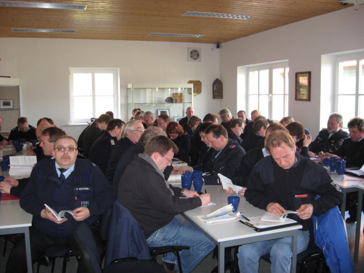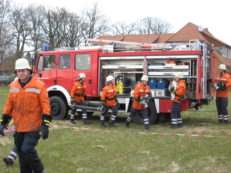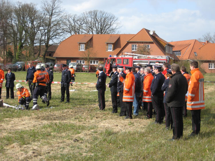 Am vergangenen Samstag waren mehr als 50 Wertungsrichter aus dem gesamten Landkreis Soltau-Fallingbostel der Einladung des Kreisausbildungsleiters „Wettbewerbe“, Matthias Schünemann, nach Düshorn gefolgt. Sie nahmen an einer Besprechung im Feuerwehrhaus teil, deren Ziel es war, die Feuerwehrleute, die bei den Stadt-, Gemeinde- und Kreiswettbewerben die Leistungen der teilnehmenden Gruppen zu bewerten haben, über die Ende 2007 verabschiedeten Änderungen der Wettbewerbsbestimmungen zu informieren. Damit soll ein korrektes und auch gerechtes Bewerten beim Leistungsvergleich gewährleistet werden. Abweichend von den landesweiten Regelungen wird es im Bereich der Polizeidirektion Lüneburg weiterhin die Gruppen „Tragkraftspritzen“ und „Löschgruppenfahrzeuge“ geben, nicht geteilt nach „Wasserführenden Fahrzeugen “ und „nicht Wasserführenden Fahrzeugen“. Auch abweichend ist die Tatsache, dass die Positionen innerhalb der Löschgruppe nicht mehr ausgelost werden, jedes Mitglied hat somit eine vorbestimmte Aufgabe wahr zu nehmen. Eine Änderung zu den alten Regeln ist zum Beispiel, dass es sich bei der angenommenen Lage nur noch um eine Brandbekämpfung ohne Personenrettung handelt. Um die Umsetzung der neuen Regeln auch praktisch bewerten zu können, war die Wettbewerbsgruppe der Ortsfeuerwehr Oyten, Landkreis Verden, nach Düshorn gekommen. Diese Gruppe konnte bereits im vergangenen Jahr Erfahrung mit den neuen Regularien sammeln und gab diese gerne an die Teilnehmer weiter.