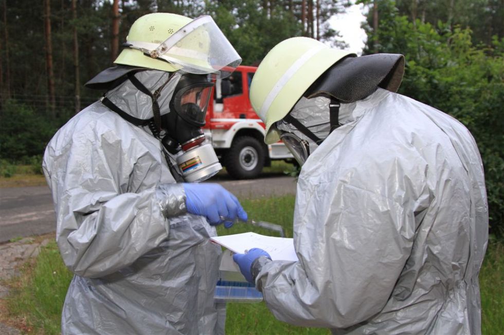 Die drei hatten eine umfangreiche Übung mit vier Stationen für die etwa 45 Einsatzkräfte vorbereitet: Messungen an Strahlenquellen, Probenahme von Feststoffen und Kontaminations-Nachweis, Aufbau eines Kontaminations-Nachweisplatzes für Personen sowie Festlegung eines Gefahrenbereiches und Bergung einer Strahlenquelle standen auf dem Dienstplan.