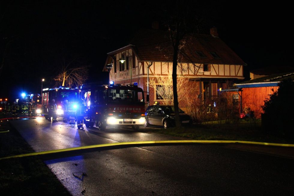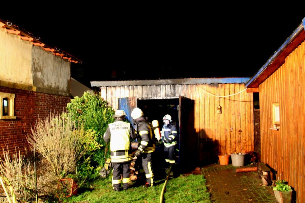 Gegen 18:11 Uhr gingen dann mehrere Notrufe ein, dass in der Ahldener Bahnhofstraße eine Garage mit angebautem Schuppen in Vollbrand steht. Noch bevor die ersten Einsatzkräfte vor Ort eintrafen, wurde das Einsatzstichwort auf Großbrand erhöht, da die Flammen drohten auf zwei direkt benachbarte Gebäude überzugreifen. Durch den massiven Wassereinsatz von ungefähr 70 Einsatzkräften konnte dieses in letzter Minute verhindert werden. Verletzt wurde bei dem Feuer glücklicherweise niemand. Die Eigentümerin wurde vor Ort von Notfallseelsorgern betreut. Der starke Wind sorgte dafür, dass Glutnester im Brandschutt immer wieder aufflammten, so dass dieser schlussendlich mit Schaum abgedeckt wurde. Im Einsatzverlauf war die Bahnhofstraße in Ahlden für den Verkehr gesperrt.