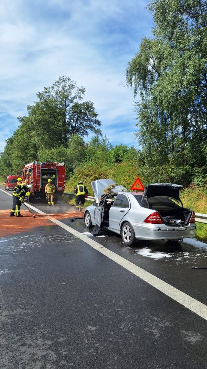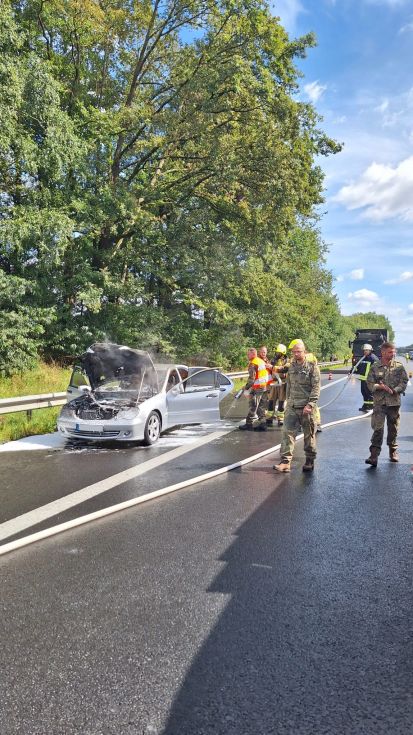 Walsrode (tk) Am frühen Nachmittag des 17.08.2025 erfolgte um 14:21 Uhr erneut eine Alarmierung für die Freiwillige Feuerwehr Walsrode. Auf der Autobahn 27 zwischen den Anschlussstellen Walsrode West und Verden Ost war aus bisher ungeklärter Ursache ein PKW in Flammen aufgegangen. Ebenfalls mitalarmiert war das Tanklöschfahrzeug aus Krelingen.