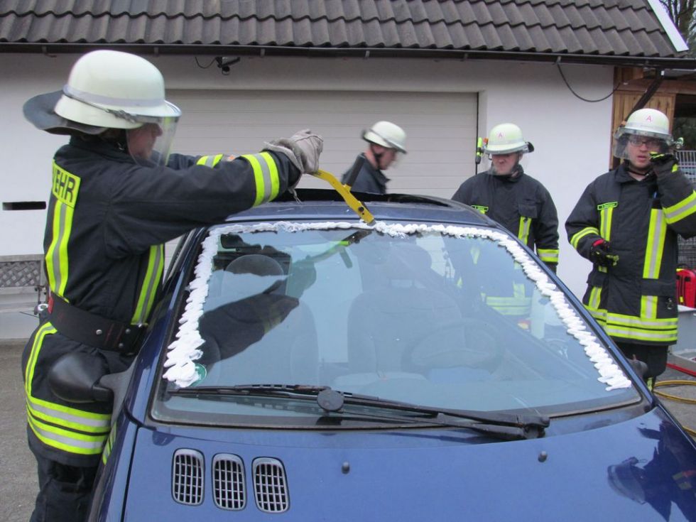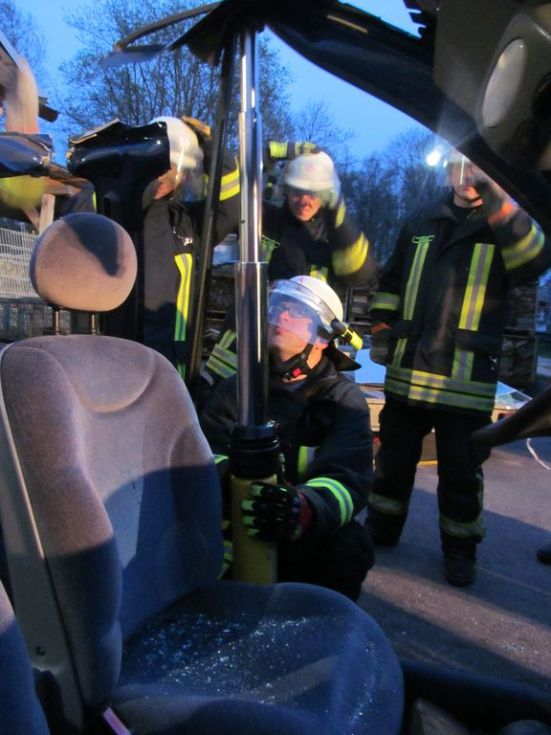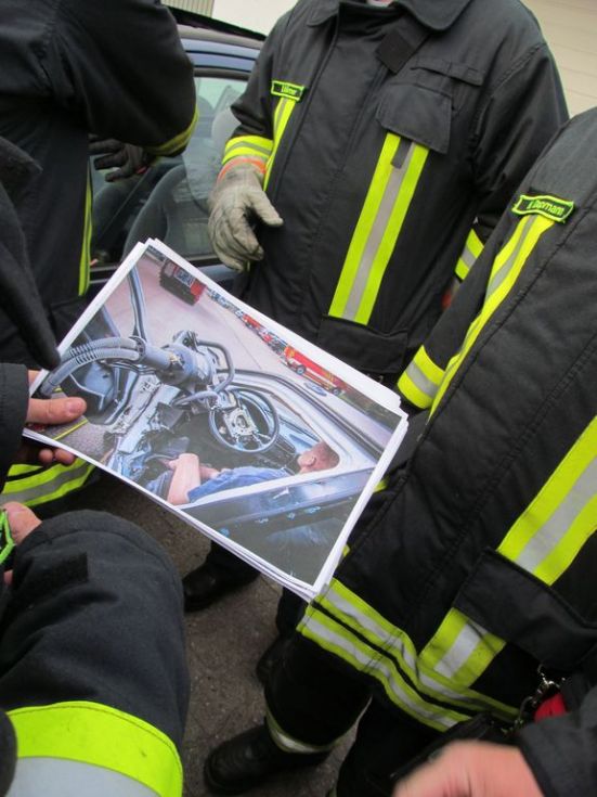 Das Ergebnis konnte sich sehen lassen. In dem rund zweieinhalb stündigen Dienst wurden viele Ideen getestet, darunter beispielsweise das Wegziehen des Lenkrades mittels Spreitzer, das Ziehen der Pedalen mittels Spreitzer und Schlinge (es wurde auch getestet, ob im Notfall auch Gurtriemen die Schlinge ersetzten können, was bestätigt werden konnte), das Festklemmen des Schwelleraufsatztes mittels Spreitzer falls ein Festpunkt fehlt usw.