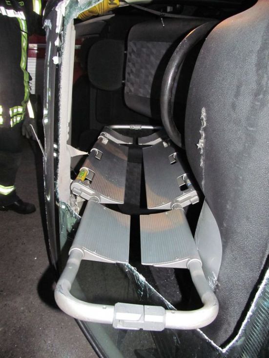 Besonders interessant war die Rettungsübung bei dem PKW, der auf der Seite lag. Hier wurde eine Idee überprüft, bei der die Frontscheibe nur zu ca. 50% ausgeschnitten wird, damit eine Auflagefläche für die Schaufeltrage entstehen kann – diese kann dann so unter den eingeklemmten Fahrer geschoben werden und liegt auf der Scheibe sowie auf der Rückenlehne auf. Dadurch würde der Patient schonender gerettet werden können.